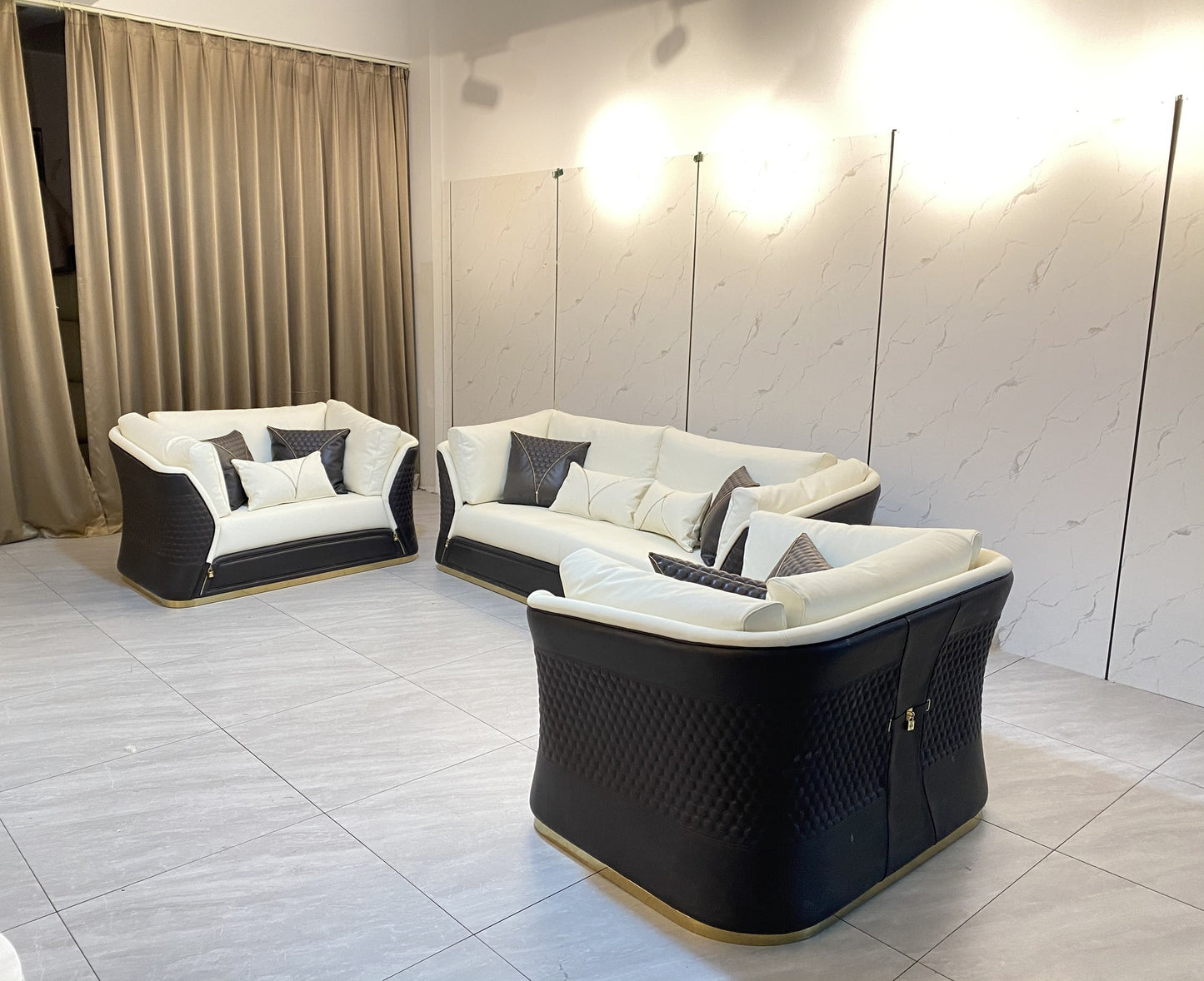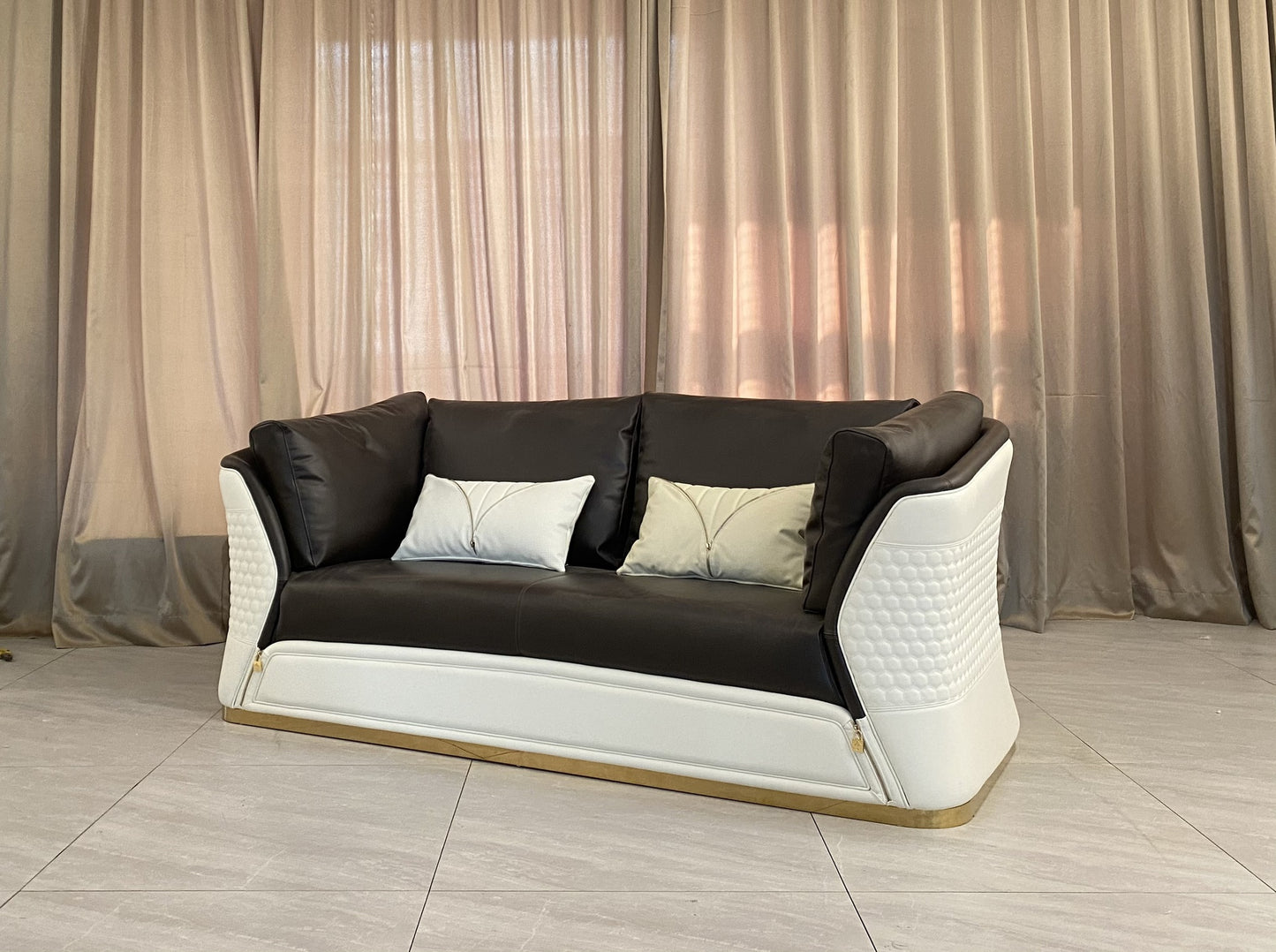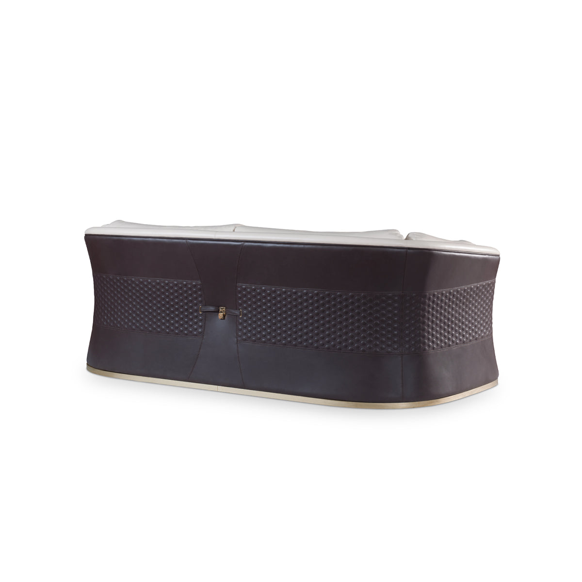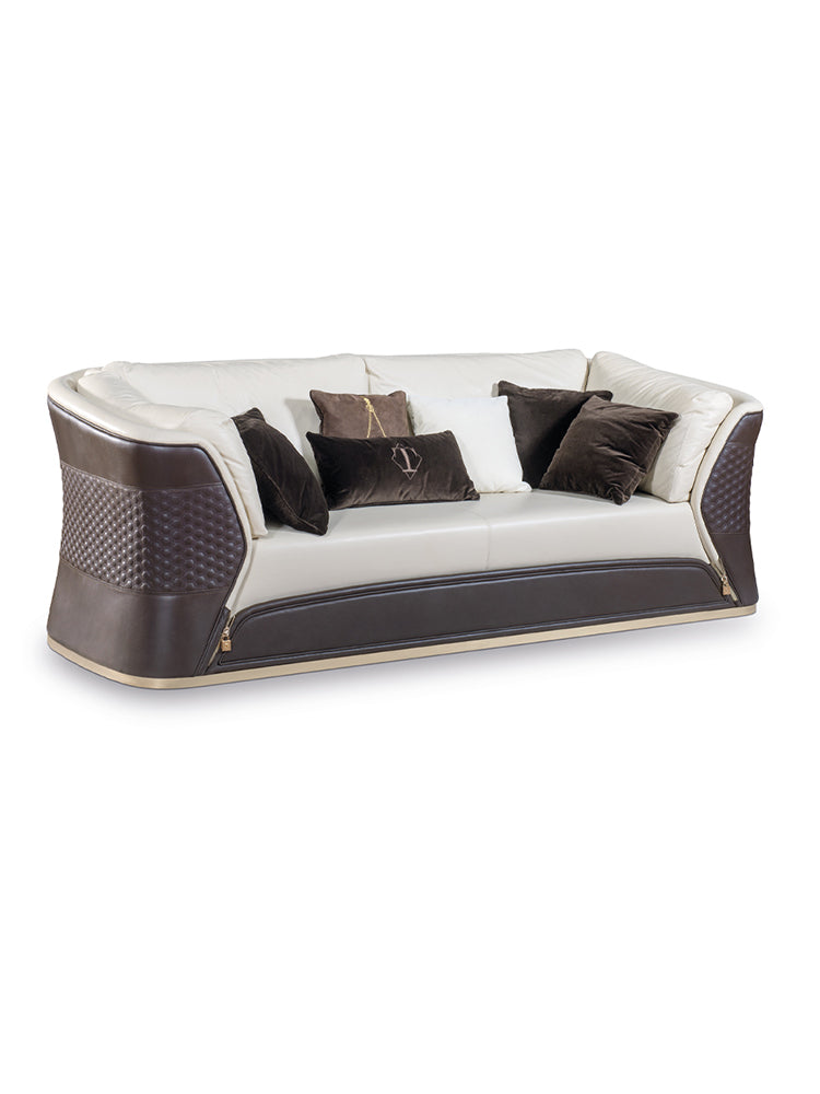 description | The sofa from the Vogue collection becomes the stylish protagonist of the living area. Available in the 2 or 3 seater version, it is made with a particular smooth metal base, this element strongly characterizes the design of the entire Vogue collection. The sofa can be upholstered in leather or fabric with hexagonal embroidery for the external structure, padlocks and decorative gold metal hinges are applied to embellish the model. |