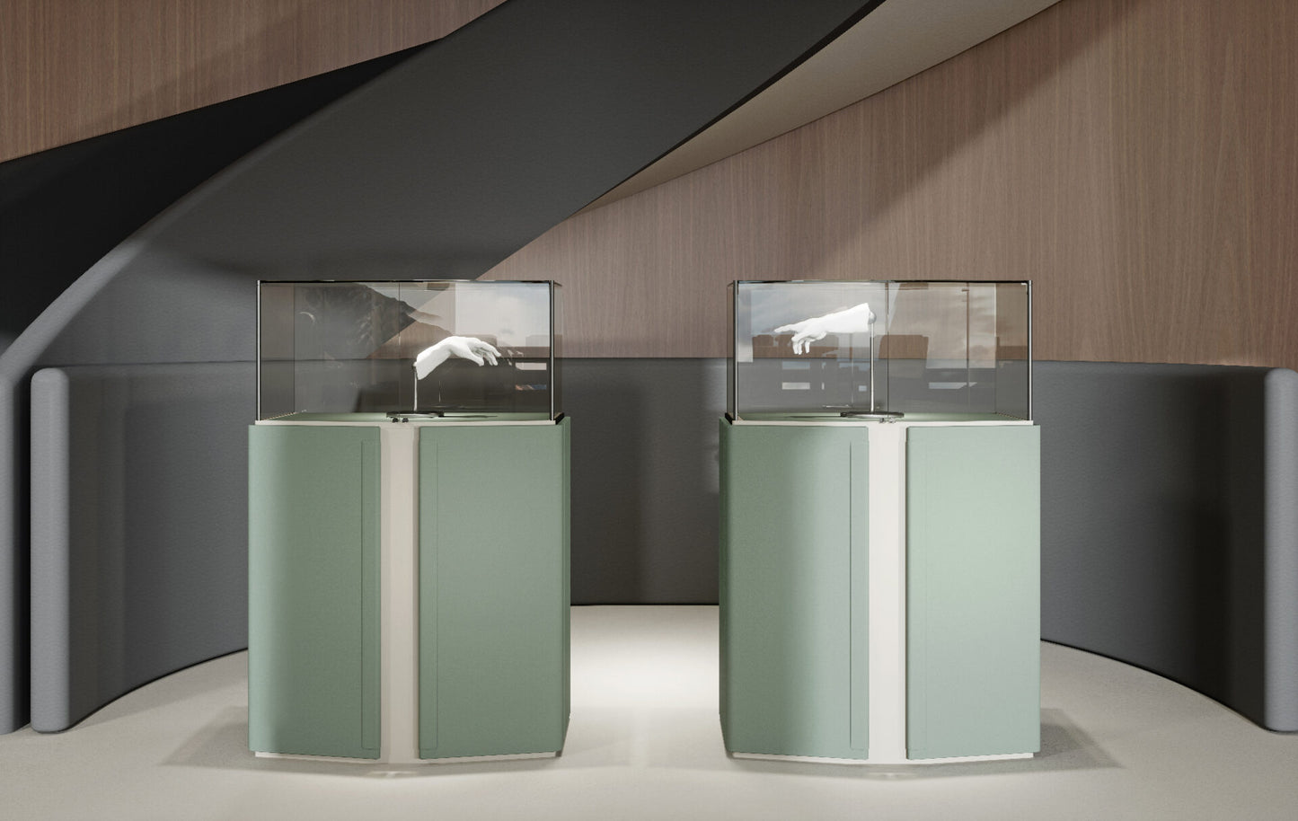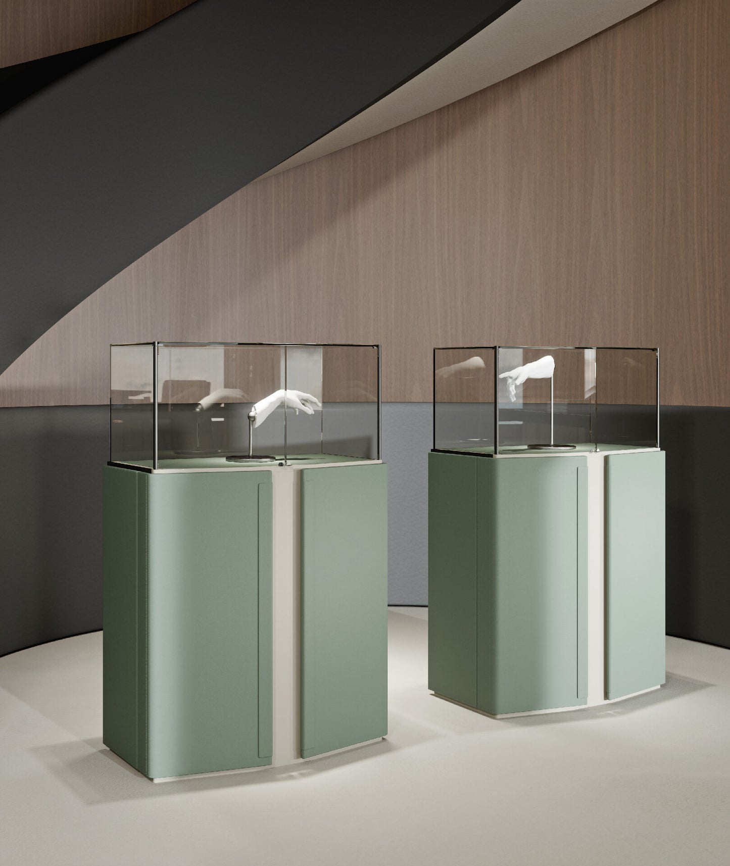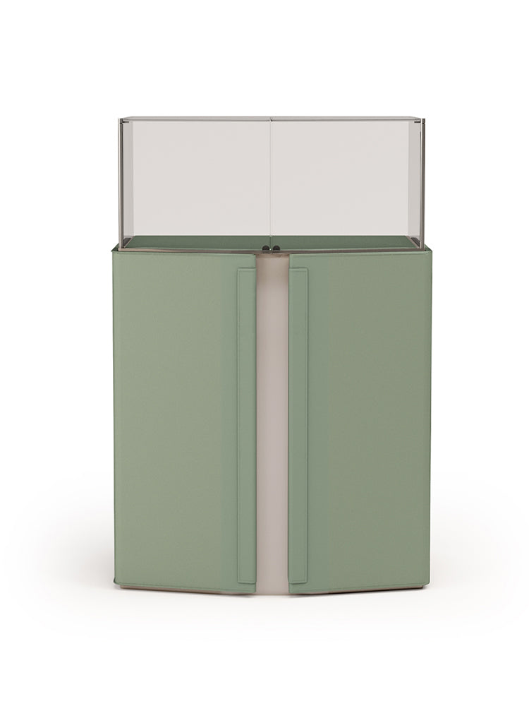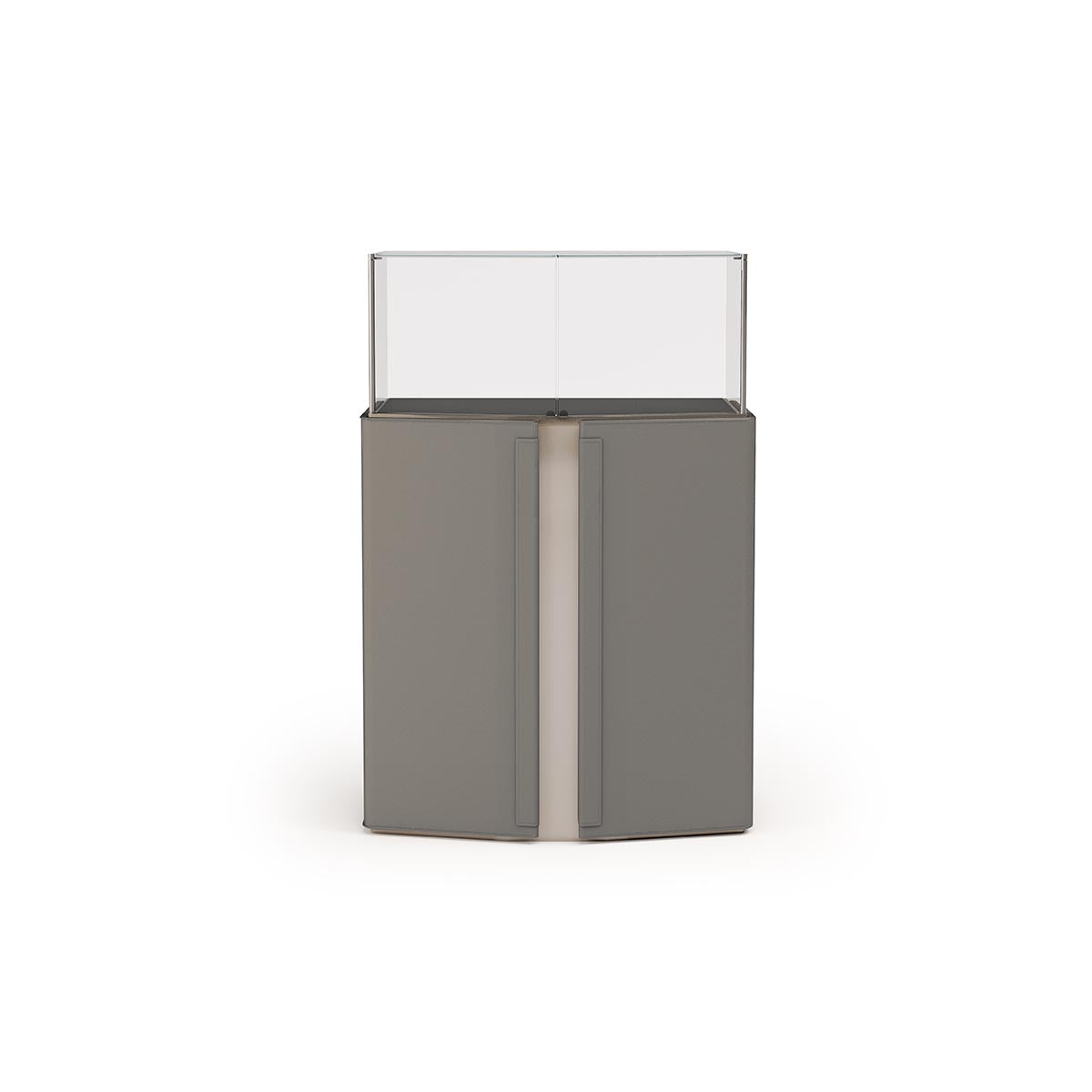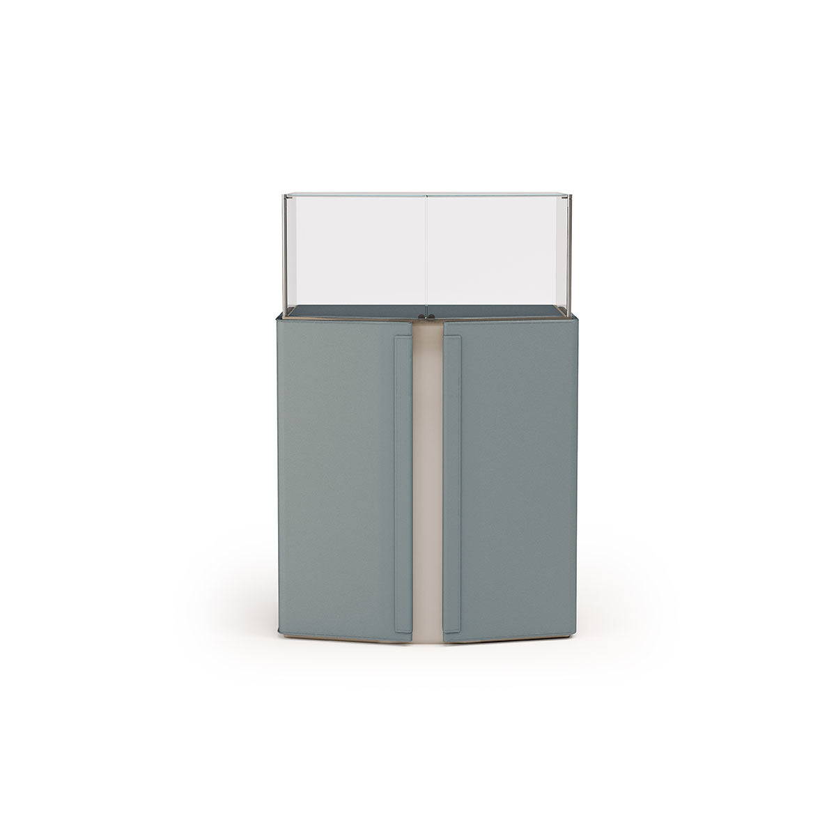 description | In the Zenit vitrine the leather doors are somewhat embracing, characterized by an extremely light display case on top. Overlapping layers is a characteristic of the entire collection, strongly evident in the shelves or the doors of the storage units. |