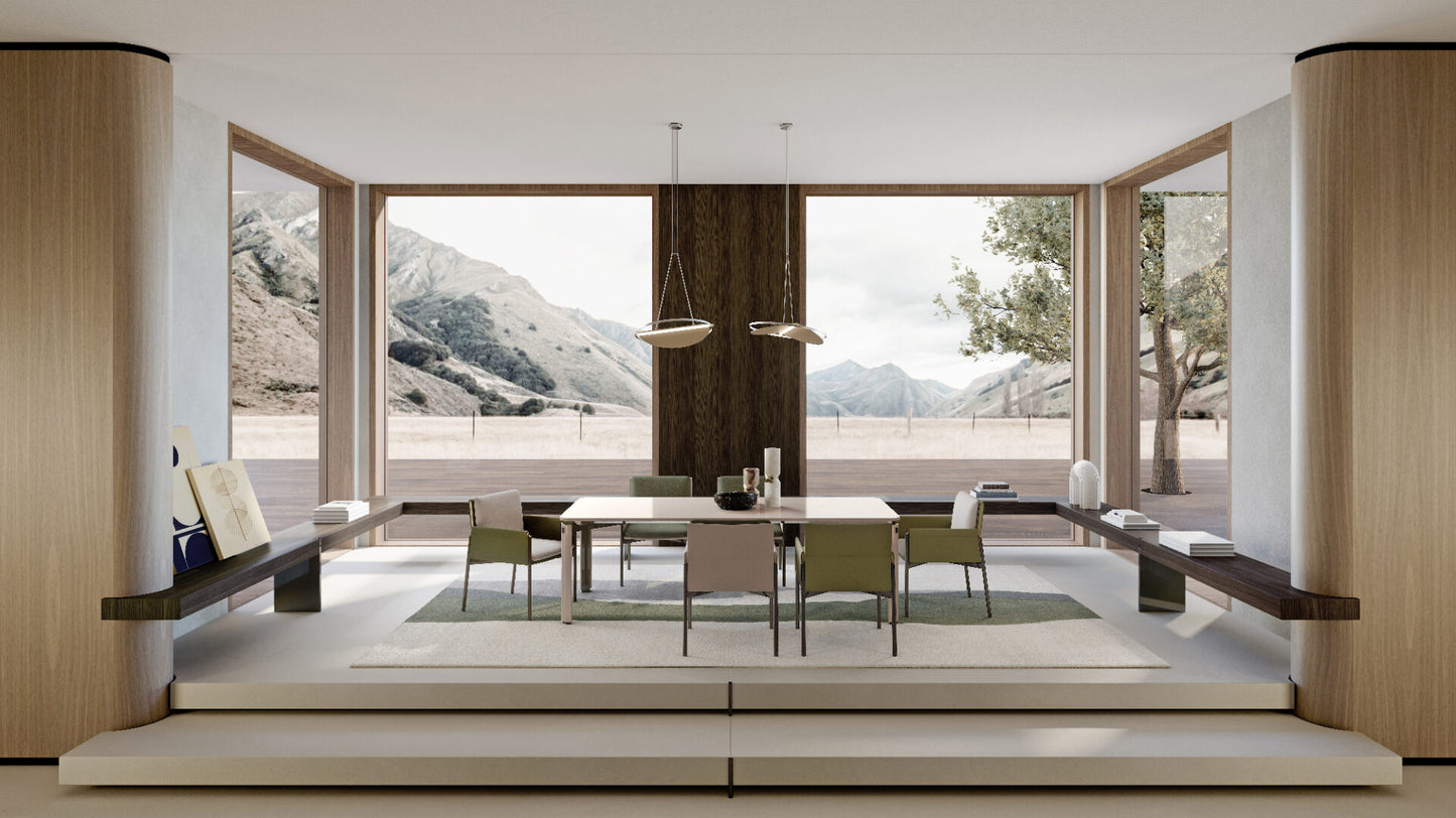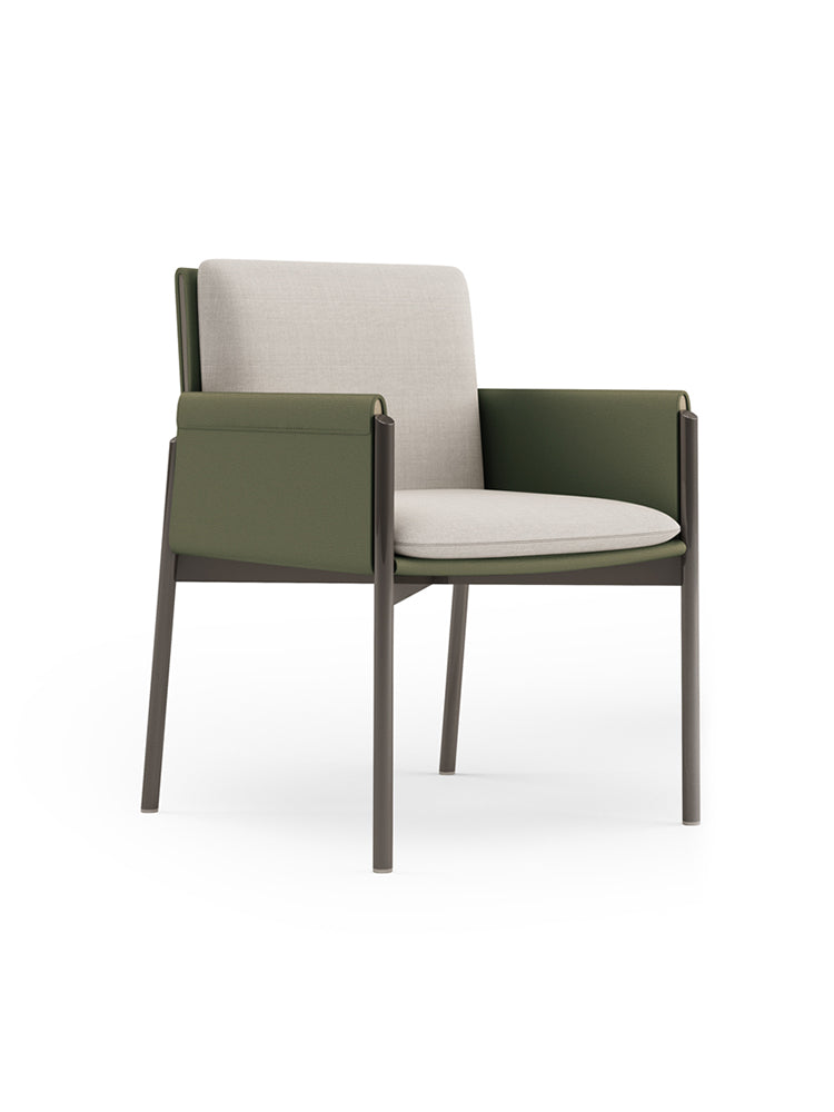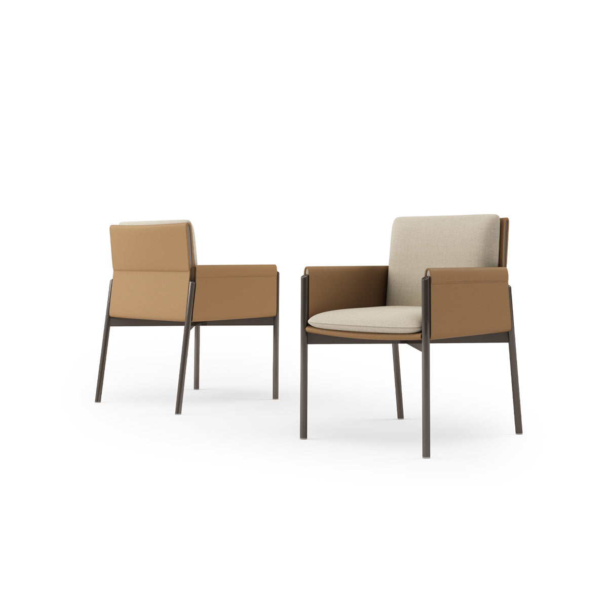 description | Suspension is the main characteristic of the Zenit collection, strongly evident in the thin lacquered metal legs of the chairs. The structure of the chairs is covered in leather with comfortable cushions for the back and the seat covered in fabric or leather. |