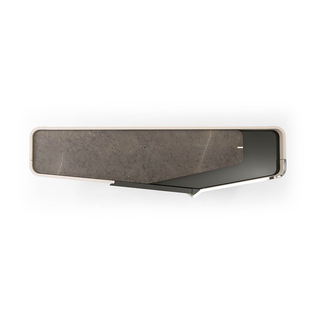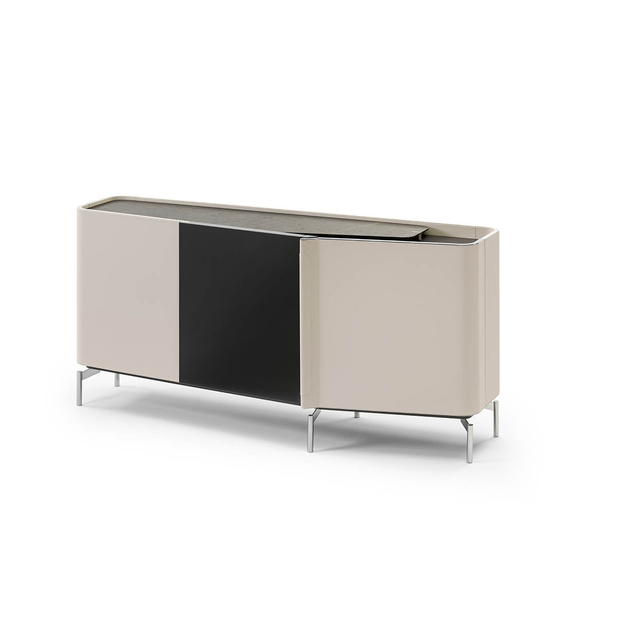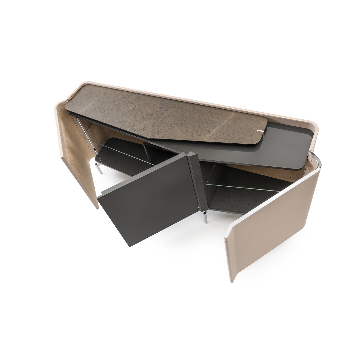 description | In the Zenit sideboard the structure and the curved leather clad doors embrace a central one in wood, and the tops are contrasting with wood and marble, one on top of the other creating a double top. Overlapping layers is a characteristic of the entire collection, strongly evident in the shelves or the doors of the storage units. |