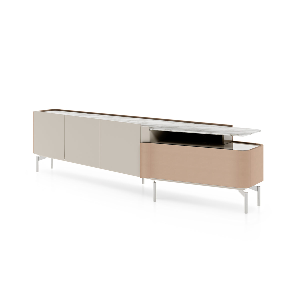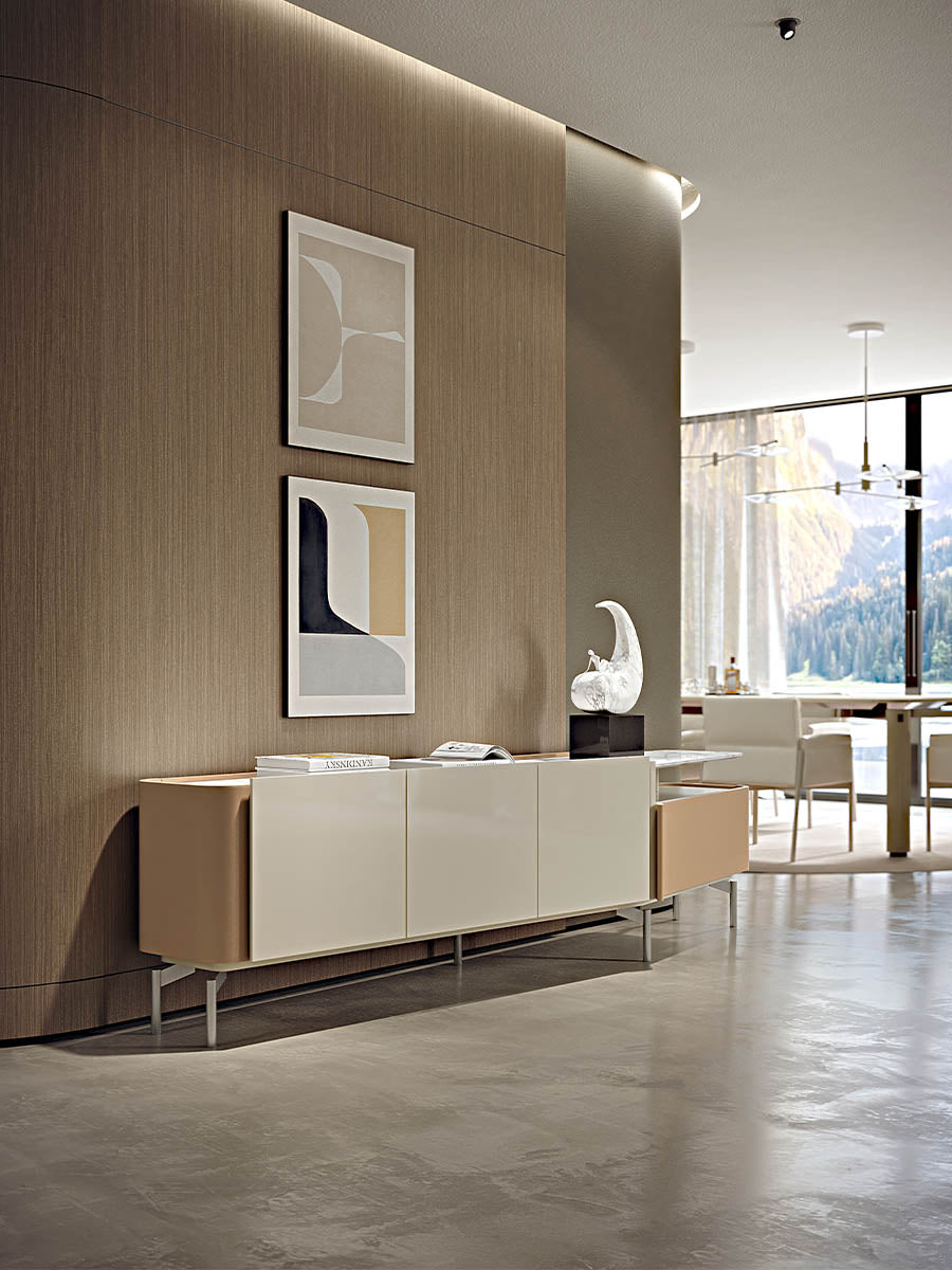 description | The TV unit of the Zenit collection enriches and completes the dining line with a strong identity character. The continuity of the three doors in glossy lacquered wood is interrupted by the more sinuous side of the cabinet: here a curved drawer, covered inleather, creates a spacious open shelf under the wooden or marble top. All supported by thin and light metal feet. |
