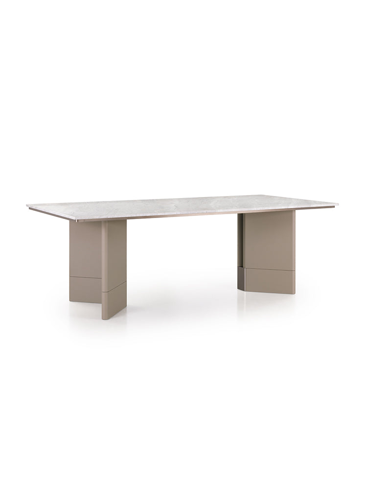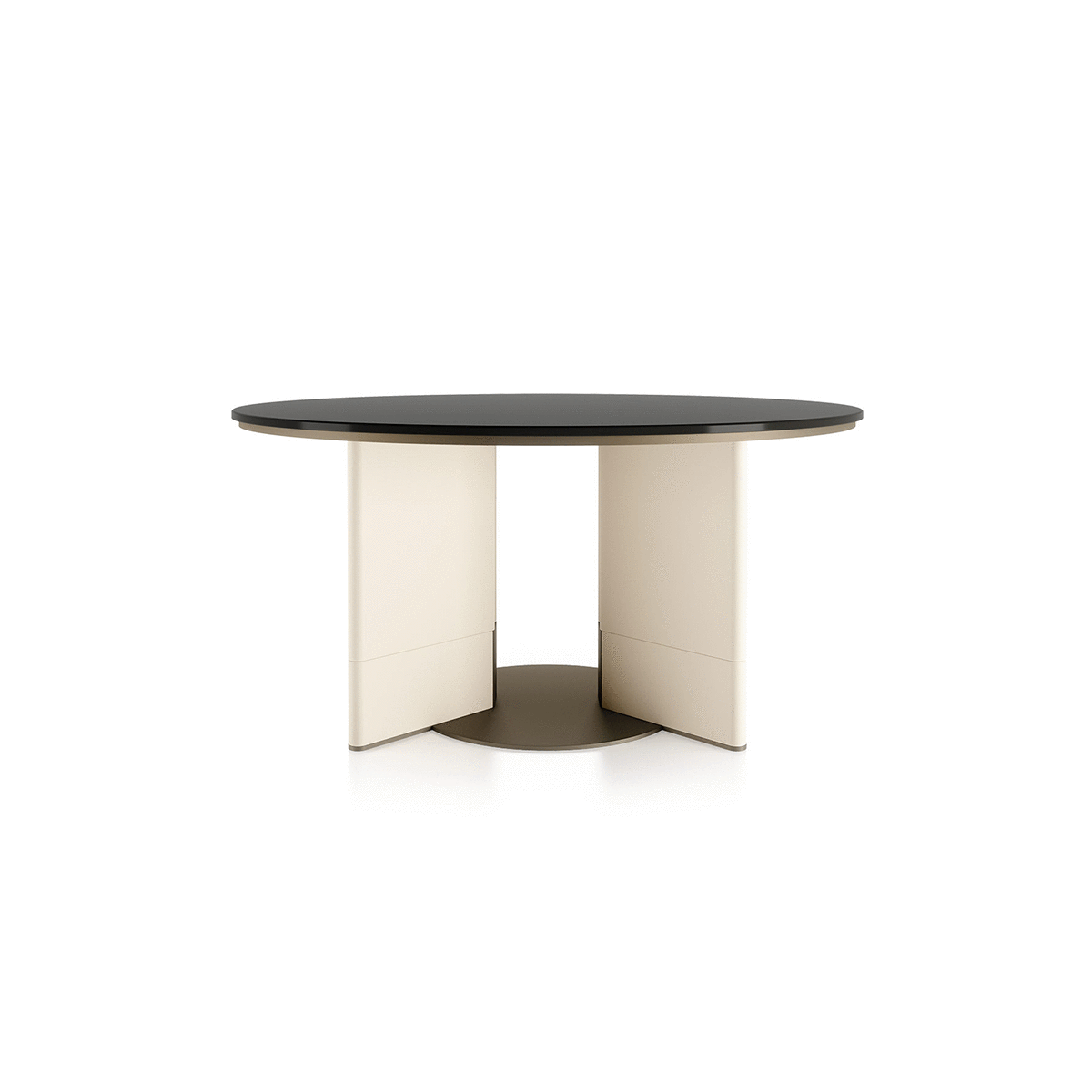description | The round table of the Zero collection has a sculptural base, given by the intersection of two wings covered in leather. The top is available in glossy lacquered wood or marble version. The table is also available in the rectangular version. |