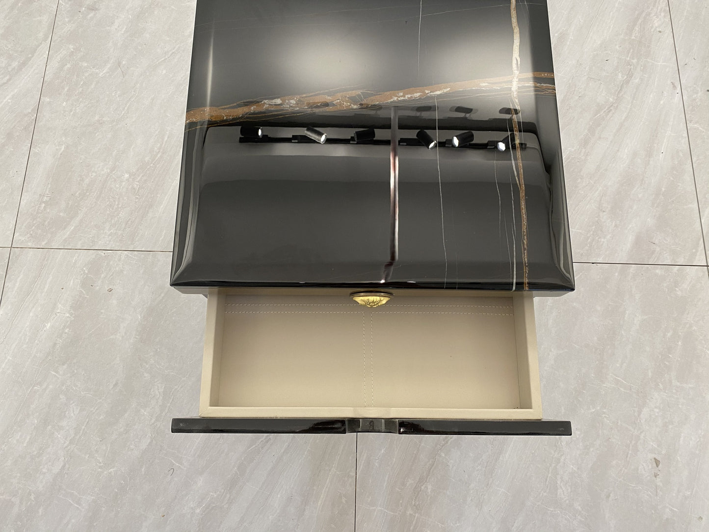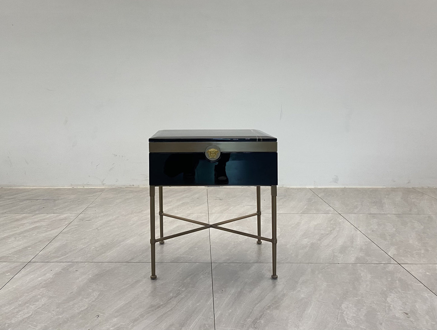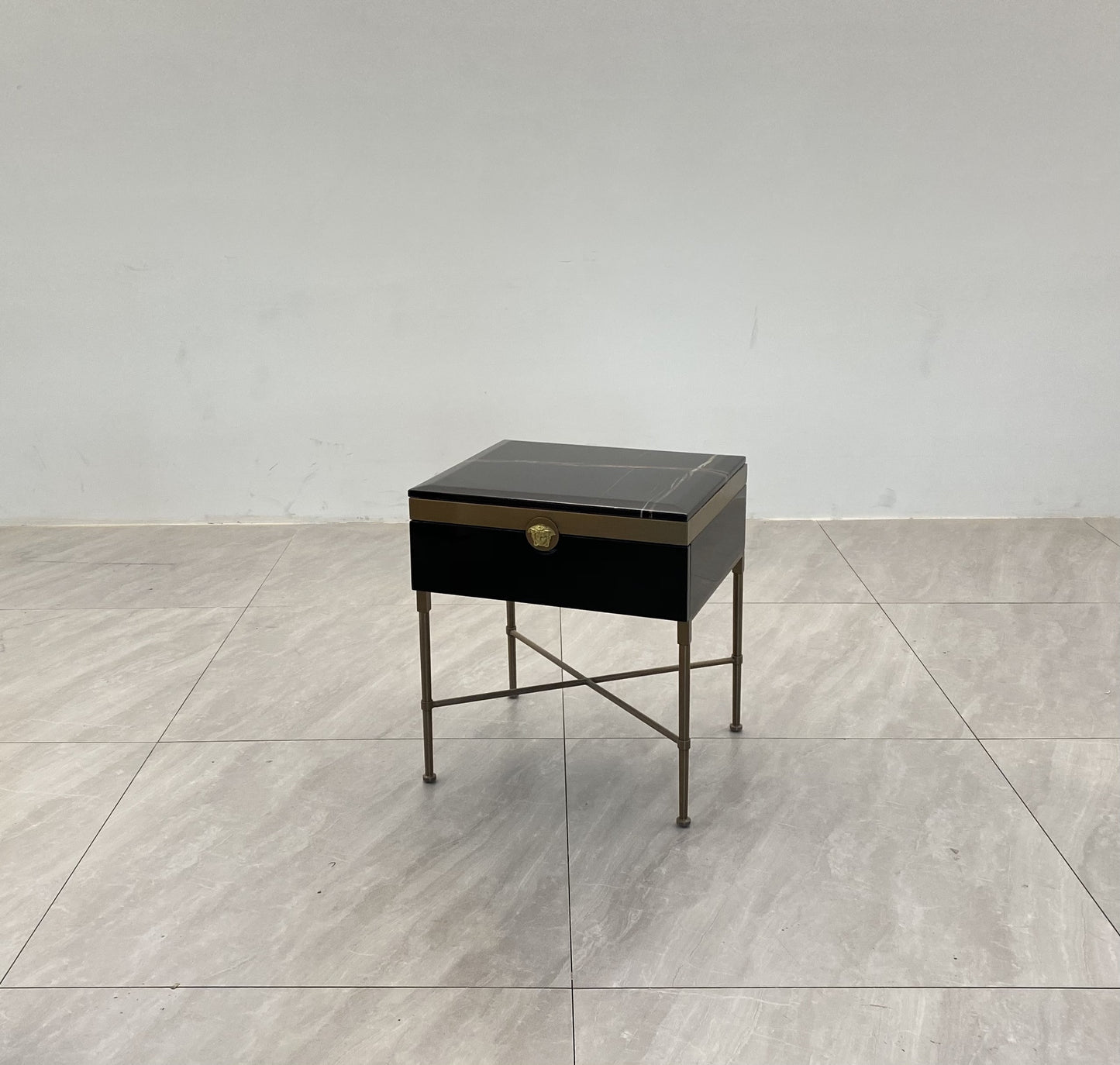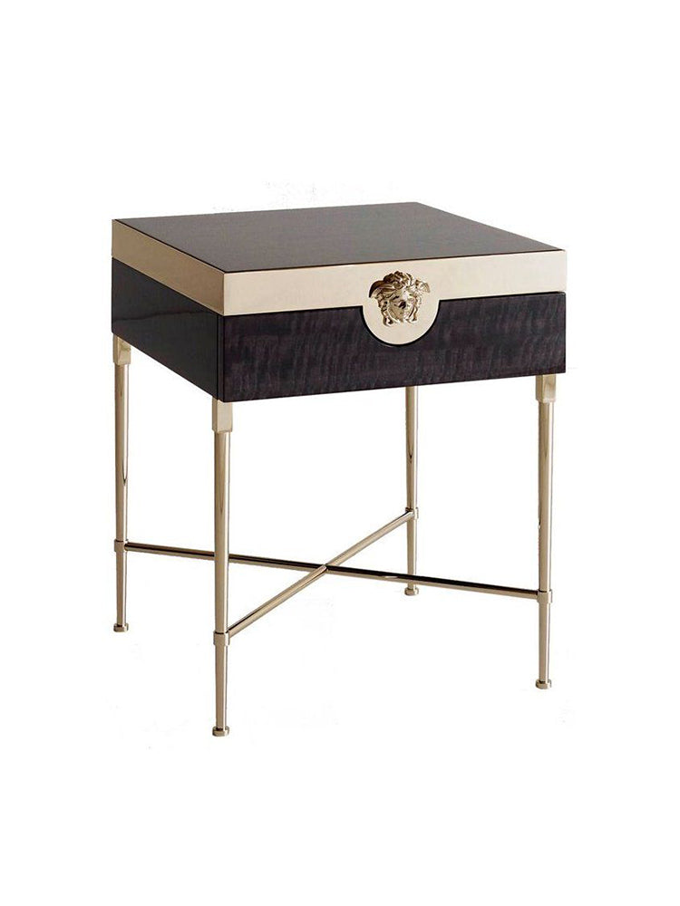 description | Argo by Versace Home is an elegant side table with light gold-finish metal structure and top in glossy black lacquered wood, embellished with the iconic sculptural Medusa logo in golden metal on the top. |