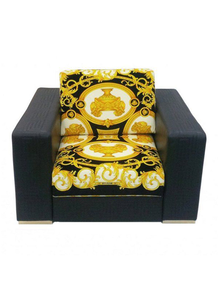 description | Couture Armchair by Versace Home is a prestigious armchair in blue Milano leather and jacquard fabric with Le Vase Baroque Caleidoscope print in black, white and gold; the structure is in wood with polyurethane foam covering. |