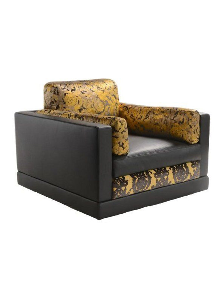 description | Duyal Armchair by Versace Home is a prestigious armchair in black Milano leather and printed jacquard velvet; the structure is in wood with polyurethane foam covering on the frame and on the seat. |
