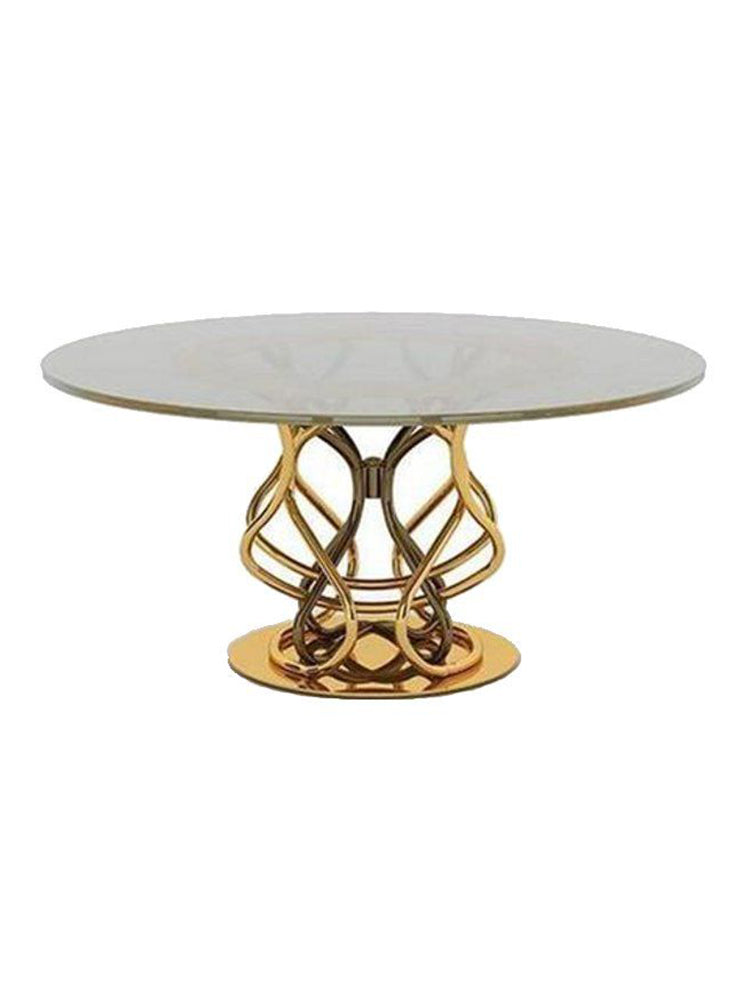 description | The Coupe Des Dieux Dining Table by Versace Home is a luxurious round dining table with a glass top and solid metal base embellished with an intertwining work in bronze and light gold finishes. |