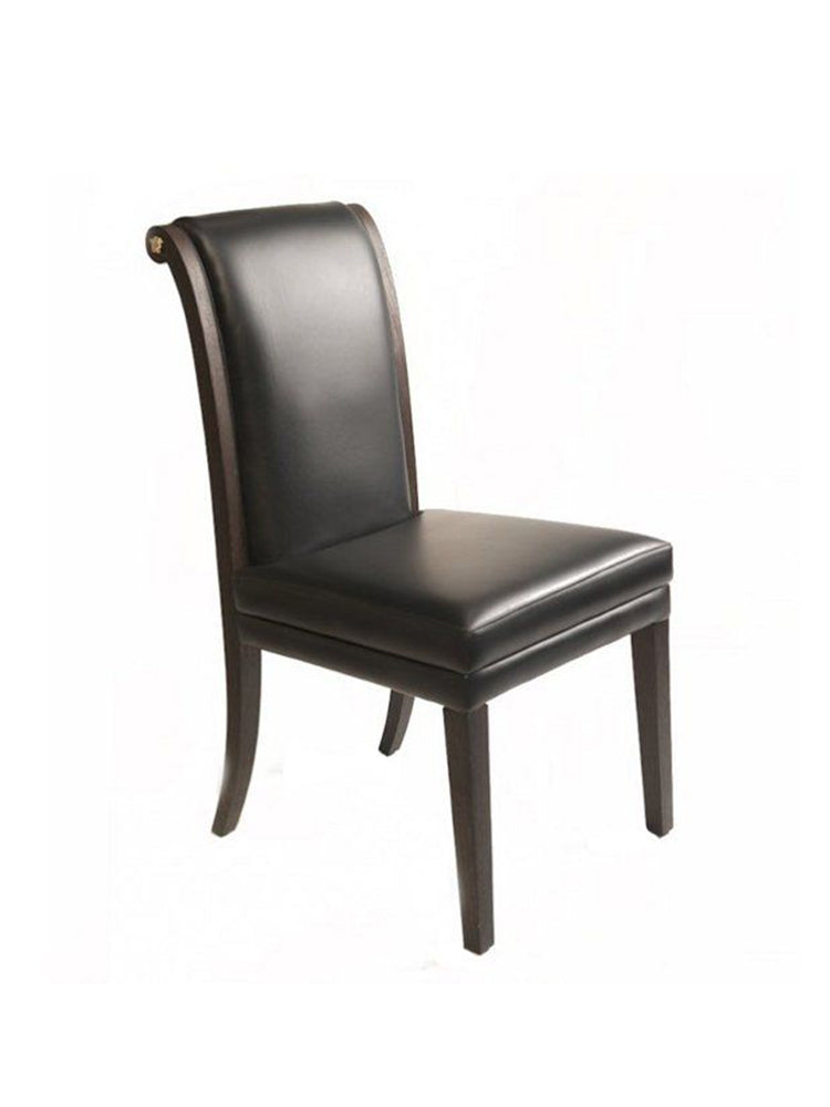 Via Gesù Dining Chair by Versace Home is a luxurious chair in black painted solid wood upholstered in fine black Milano leather with polyurethane foam padding and embellished with 3D sculptural Medusa in golden metal MT-02. |
