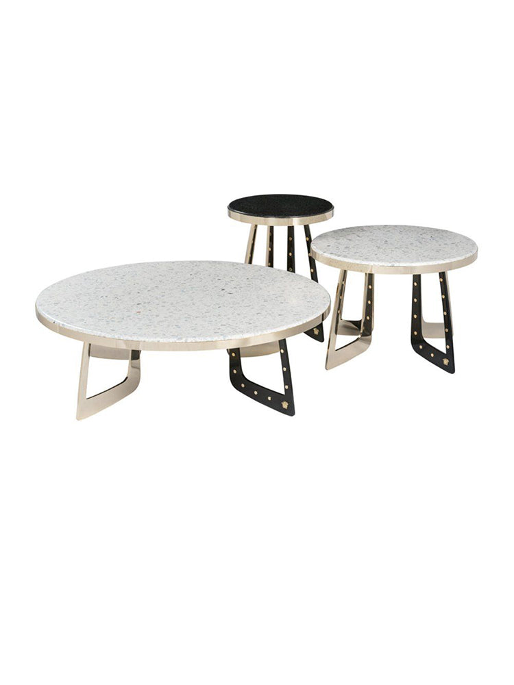 description | VT1 Tryptique by Versace Home is an elegant 100x30 side table with top in prestigious white Terrazzo marble. The solid metal structure is supported by three legs with a light gold finish and a glossy black one; the whole is enriched with precious light gold-finish metal studs and the unmistakable 3D sculptural Medusa. |