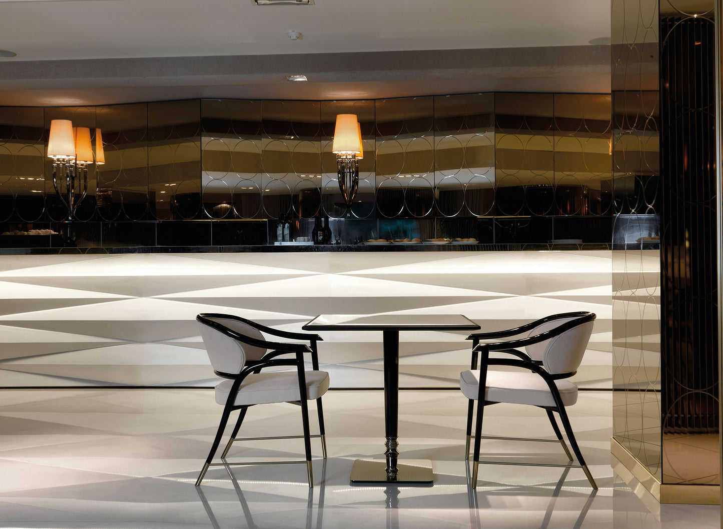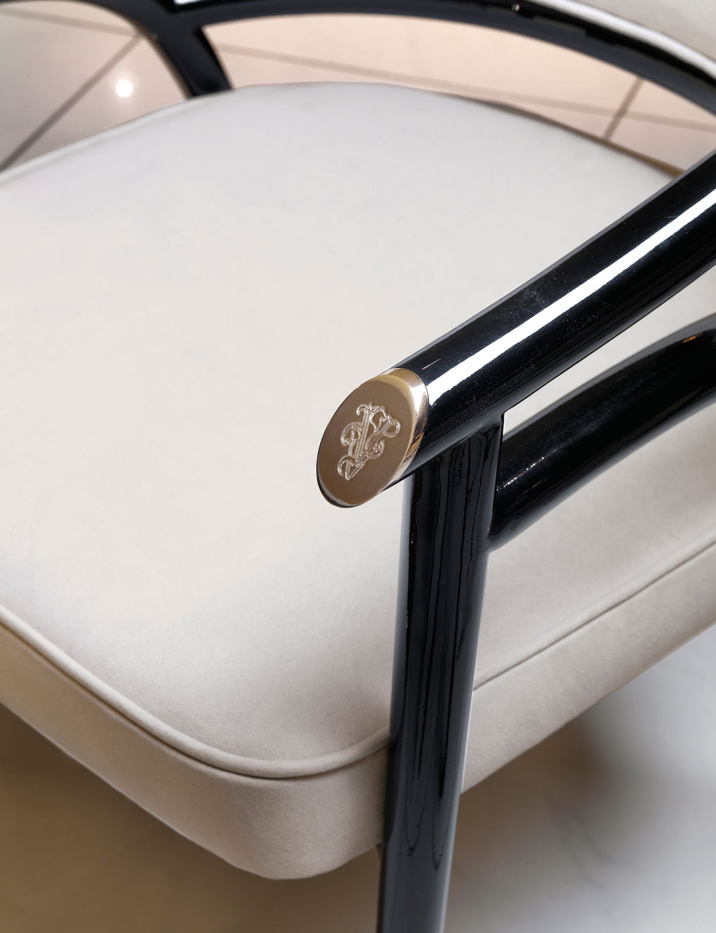 description | Structure in solid shaped and lacquered polish wood (RAL colours). Backrest in curved upholstered plywood. Seat in padded wood and quilted. Turned aluminium nails and crossbars, and chromed engraved logo in the armrest in gold, bronze or black nickel. |