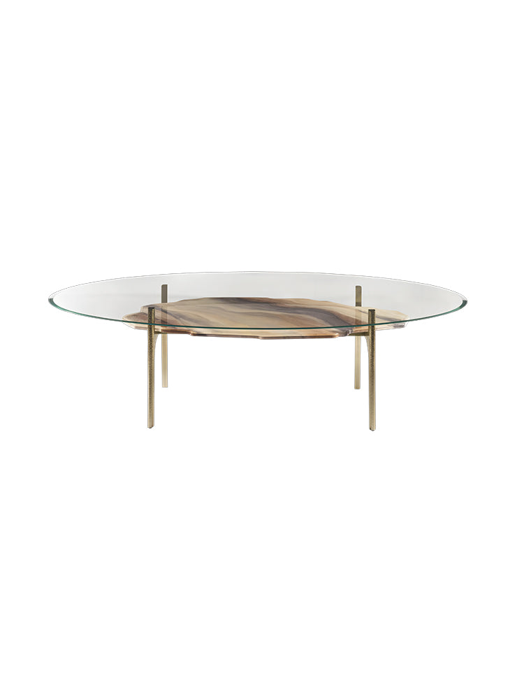 description | Main structure in aluminium cast and steel. Four legs with hammered finish are polished by hand and connected to the main frame sustaining the lower top in marble Crema Marfil marble is treated and decorated by hand, creating a basrelief mineral texture on its surface, available in two colour variations (“Laguna” or “Tenerife”). Top in extra clear tempered glass. Metal parts can be lacquered in any colour included in the metal finish selection. |