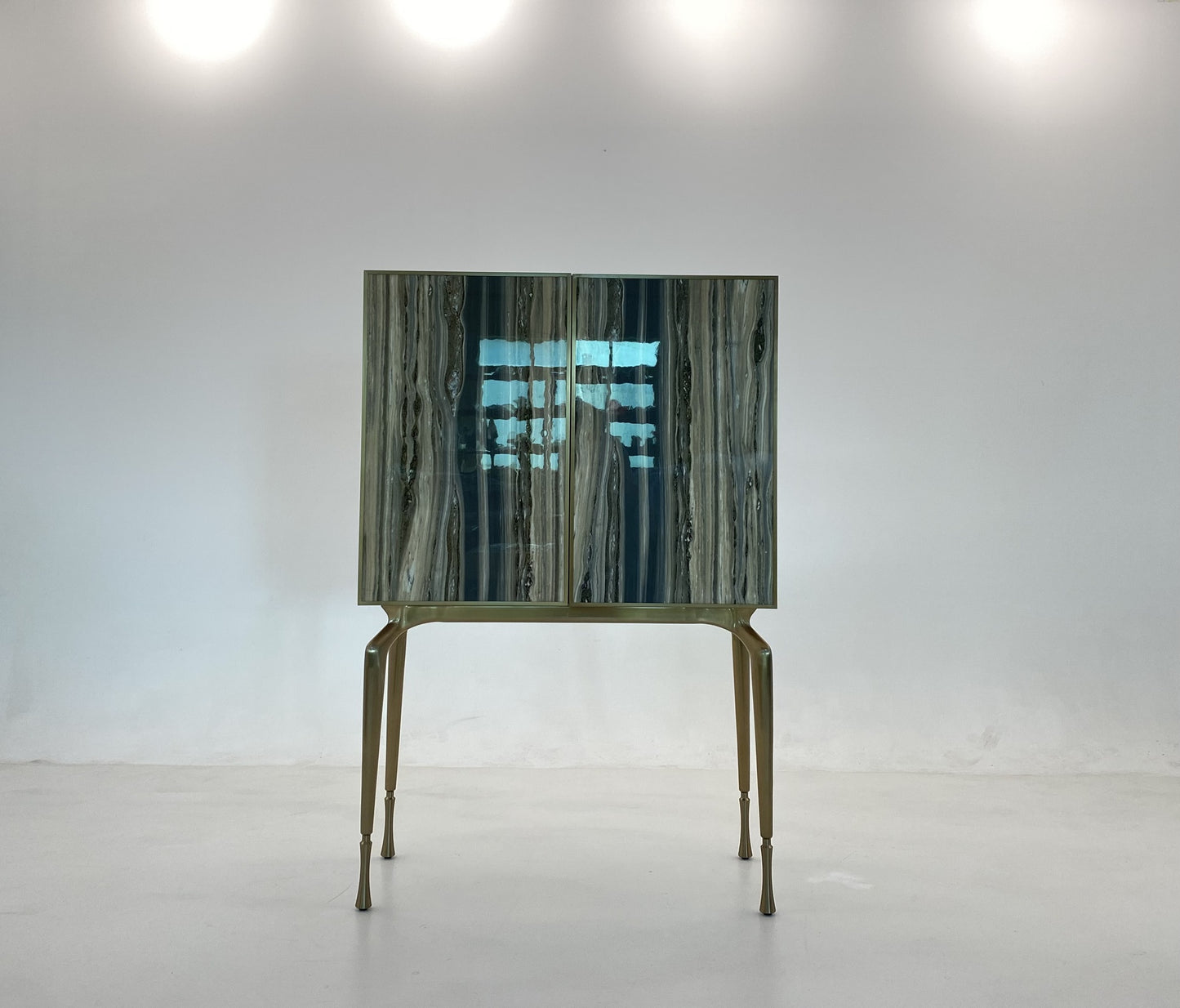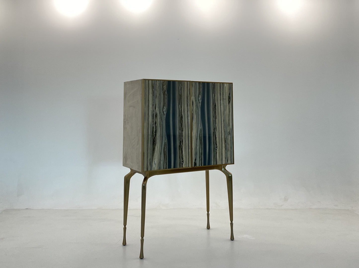 description | Structure in lacquered or veneered, polished in 100 gloss (both internally and externally). Doors with full-opening system (180°) covered in marble with inlays and frame in polished stainless steel. Internally equipped with 4 shelves, 2 drawers and storage shelves inside the doors. Legs in mirror-polished aluminium cast with tips in satinized aluminium. Wooden parts are available with veneer selection finishings; metal parts can be lacquered in any colour included in the metal finish selection. |