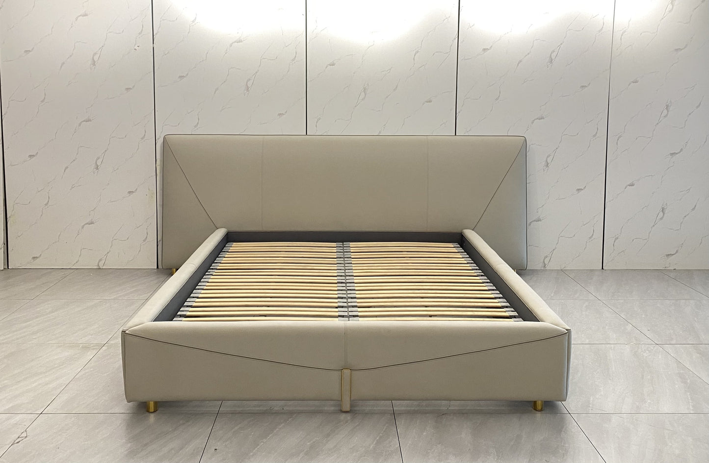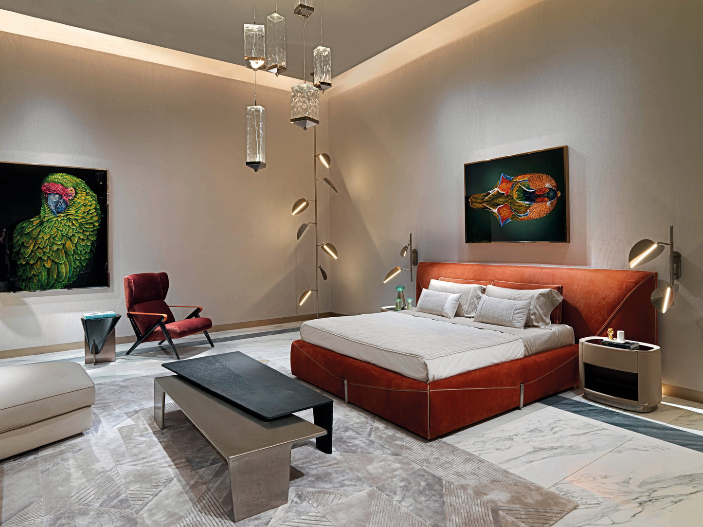 description | BASTIAN LARGE Bed upholstered in leather or fabric. Internal structure in solid wood and shaped plywood, padding in polyurethane foam with different densities. Shaped headboard padded and decorated with piping and edges with topstitching in leather with contrasting colour. Two decorative pillows in feather with the same upholstery are provided. Bed-frame composed by three elements padded and decorated with piping and edges in contrasting leather. Friezes on the bed frame are in aluminium and satin stainless steel, with dou- ble finish. They can be lacquered in any colour included in the metal finish selection. Slats in wood are supported by four corner brackets and one central rod, with adjustable height, in varnished steel. LED courtesy light can be mount- ed under the headboard profile upon request. Shown with bed linings, pillows and bedcover Mirabell. BASTIAN REGULAR Bed upholstered in leather or fabric. Internal structure in solid wood and shaped plywood, padding in polyurethane foam with different densities. Shaped headboard padded and decorated with piping and edges with topstitching in leather with contrasting colour. Two decorative pillows in feather with the same upholstery are provided. Bed-frame composed by three elements padded and decorated with piping and edges in contrasting leather. Friezes on the bed frame are in aluminium and satin stainless steel, with double finish. They can be lacquered in any colour included in the metal finish selection. Slats in wood are supported by four corner brackets and one central rod, with adjustable height, in varnished steel. Shown with bed linings, pillows and bedcover Mirabell. |