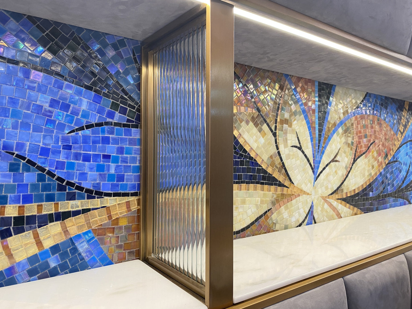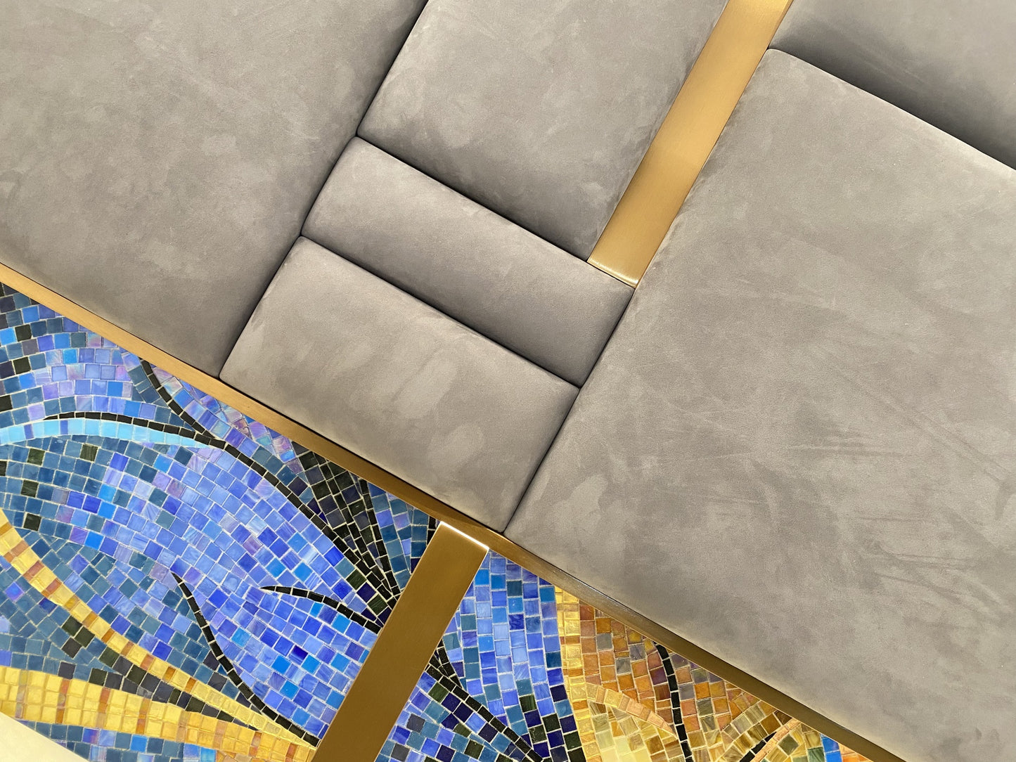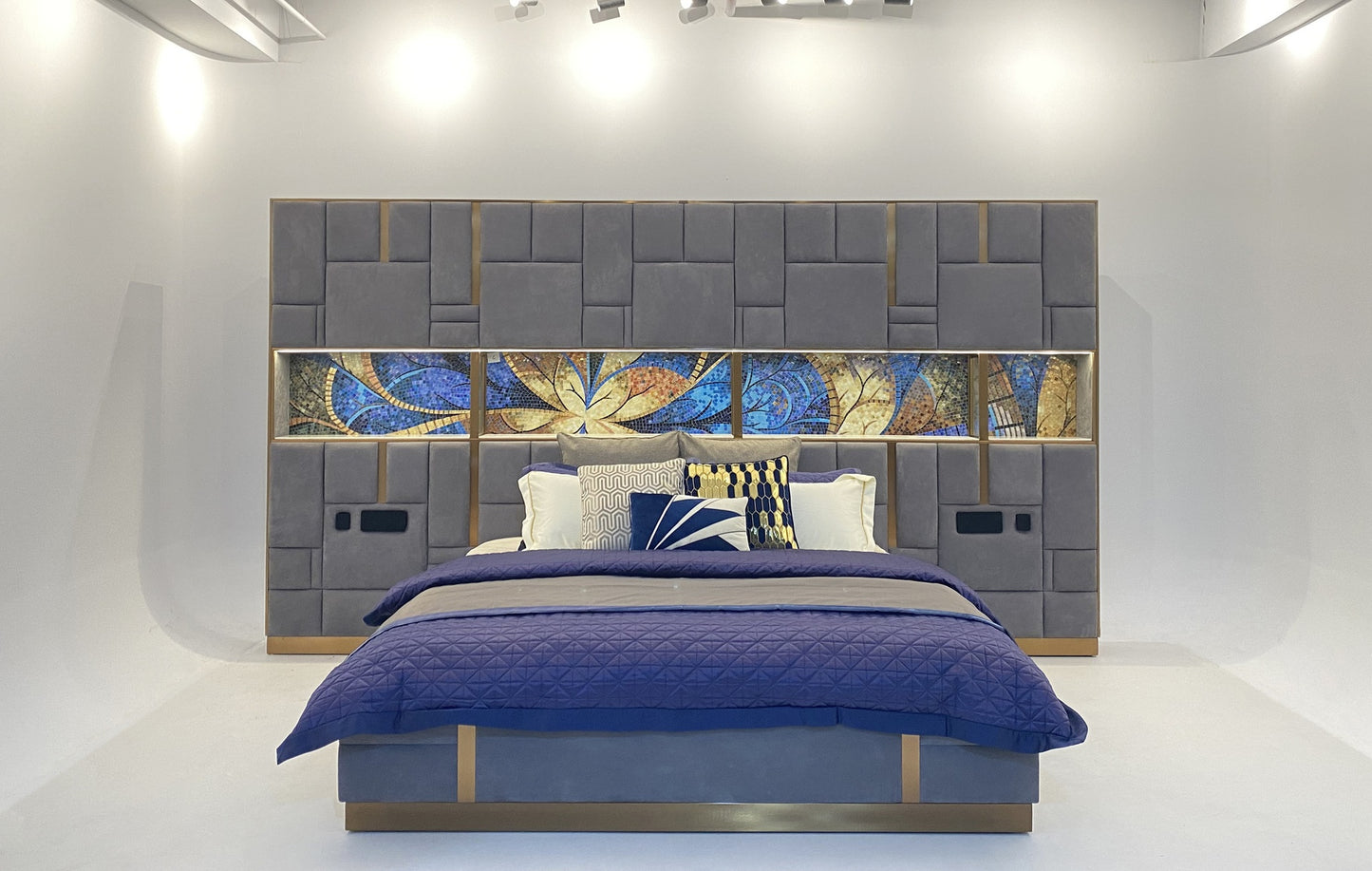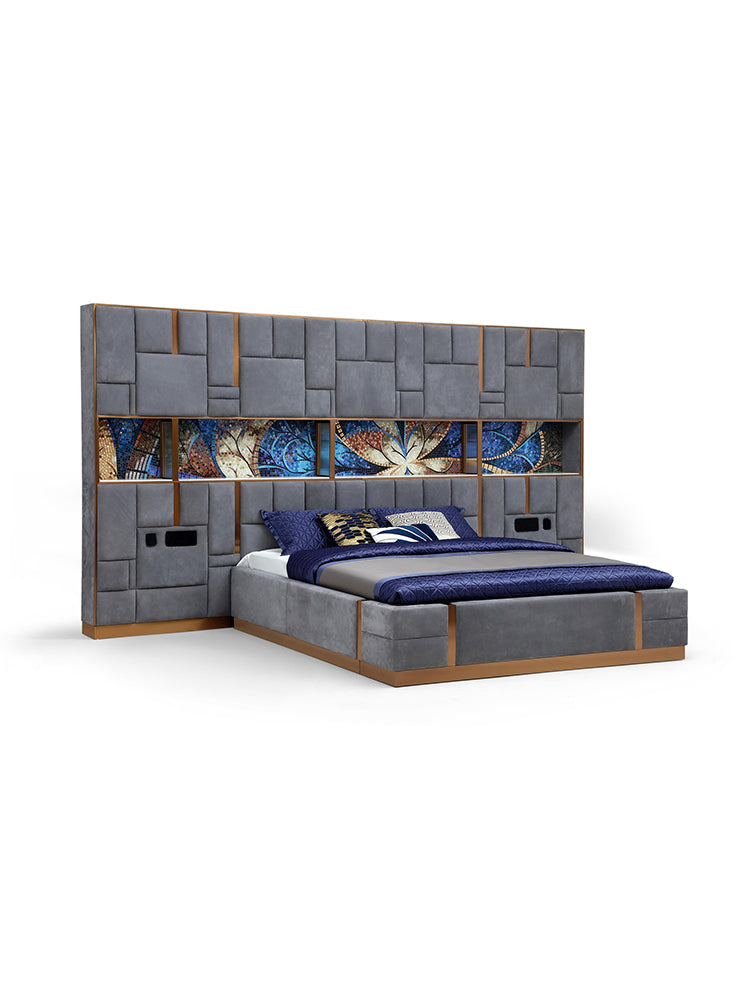 description | Bed upholstered in leather or fabric. Headboard padded as to design a geometric pattern; structure in plywood panels and solid wood with slightly padded tiles, upholstered one by one. Plinth and decorative elements inserted into bed base and headboard in stainless steel with satin finish. Storage compartment with back panel decorated with artistic artwork by Michele Astolfi made in printed polycarbonate and decorated with inserts in artistic glass and Swarovski crystals. LED courtesy lights. Headboard provided disassembled and designed to be installed on the wall. Bed base in plywood padded with polyurethane foam, consisting of several elements upholstered one by one and decorated with inserts and base in satin stainless steel. Wooden slats, slats supported by four corner braces and one central rod in lacquered steel, adjustable in height. Decorative metal elements can be finished with any lacquer of the metal lacquer finish selection. Shown with bed linings, pillows and bedcover Ernon. |