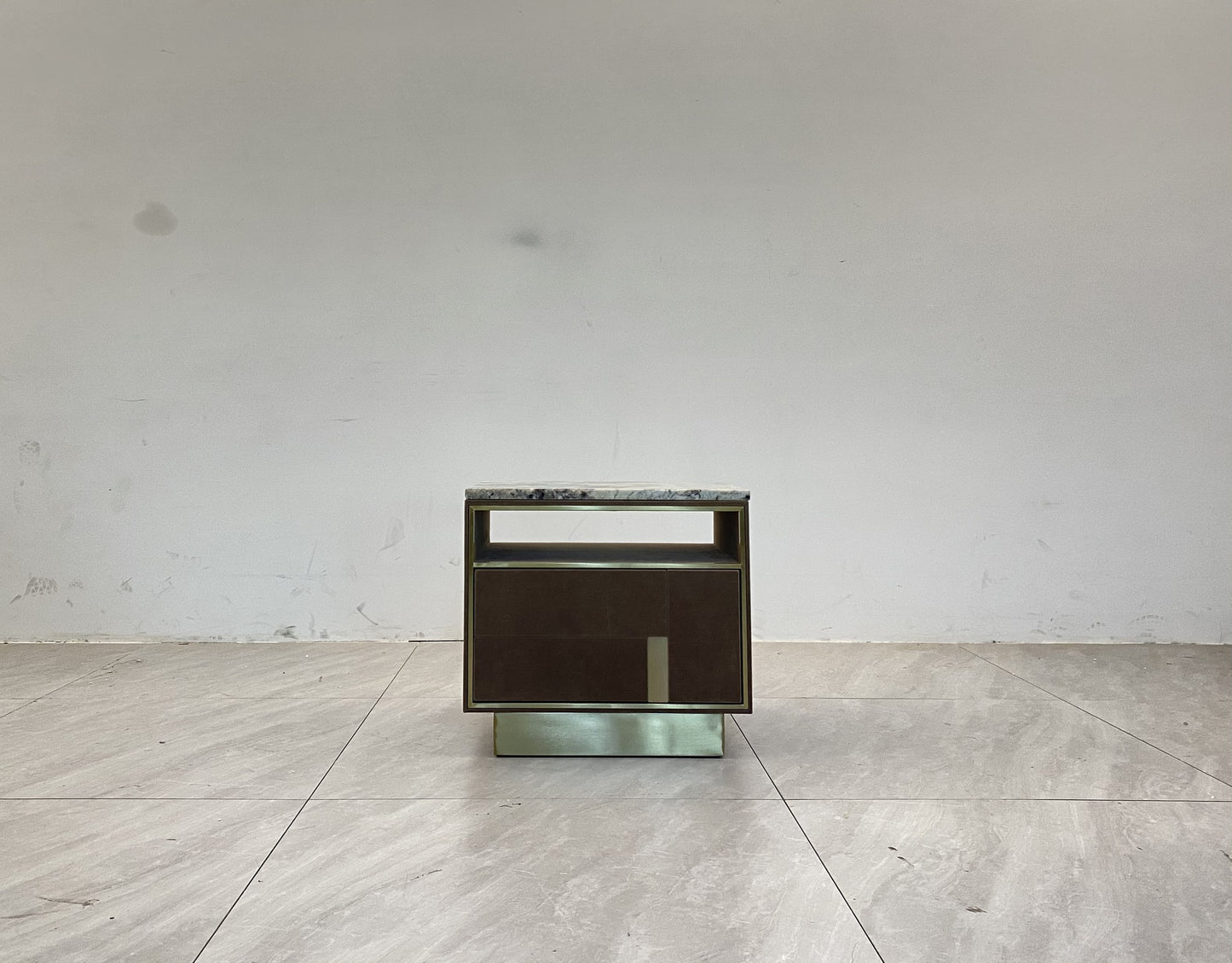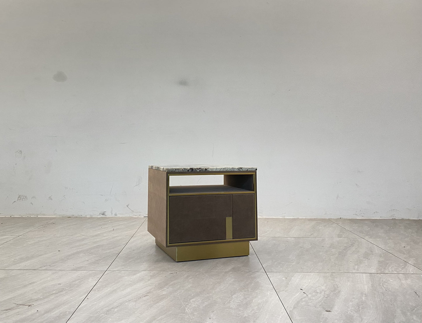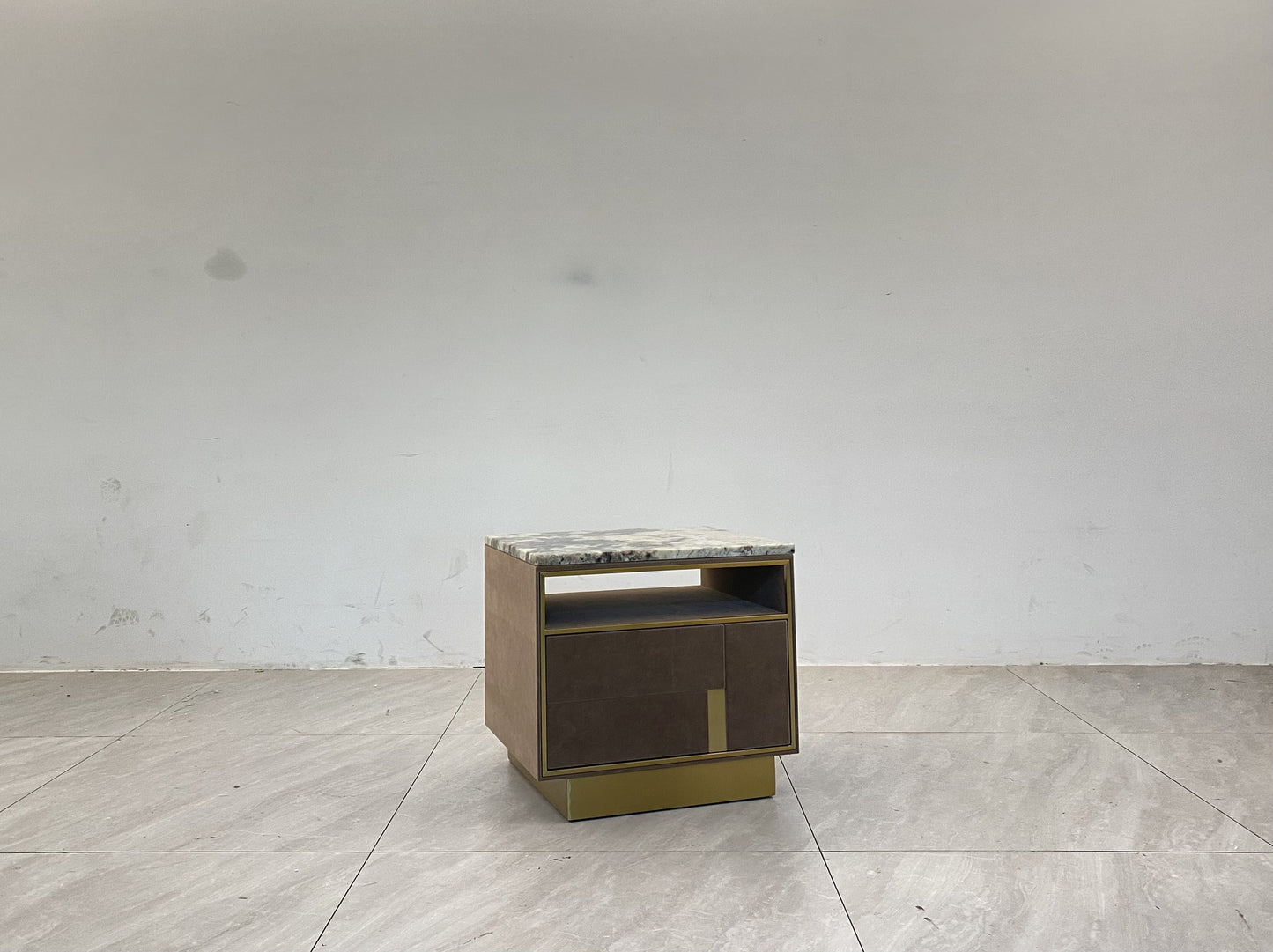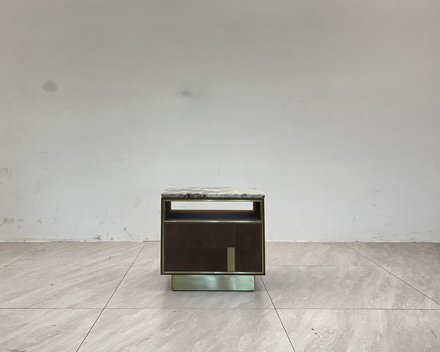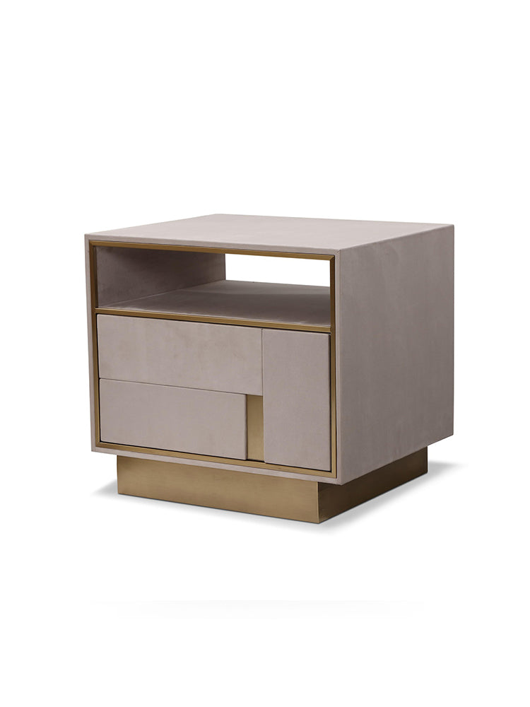 description | Bedside table upholstered creating a geometrical pattern. Structure in plywood, drawer padded in polyurethane, finished in slightly padded panels individually upholstered in leather or fabric. Insert in satinized stainless steel with engraved logo. Open shelf with courtesy LED light; edge with frame in polished stainless steel. Plinth in satinized stainless steel. Metal parts available in the metal finishing selection. |