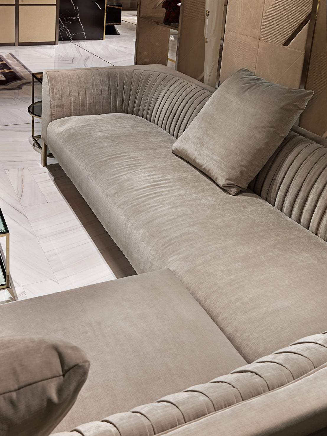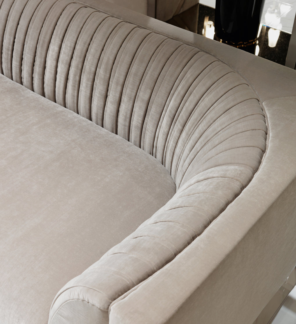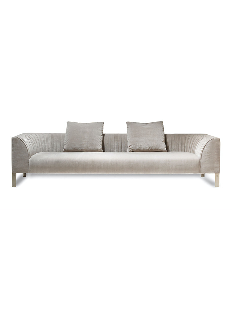 description | Wooden and metal structure with spring system with straps; padding in polyurethane foam in different densities. Seat cushion in polyurethane, Memory Foam® and acrylic fibre. Embracing backrest with largepleats pattern, padded in acrylic fibre; loose cushions in feather. Upholstery in leather or fabric. Feet in stainless steel, semi-cylindrical in shape, flat part with satinized finishings and Visionnaire logo engraved. Metal parts can be finished with any lacquer of the metal lacquer finish selection. |