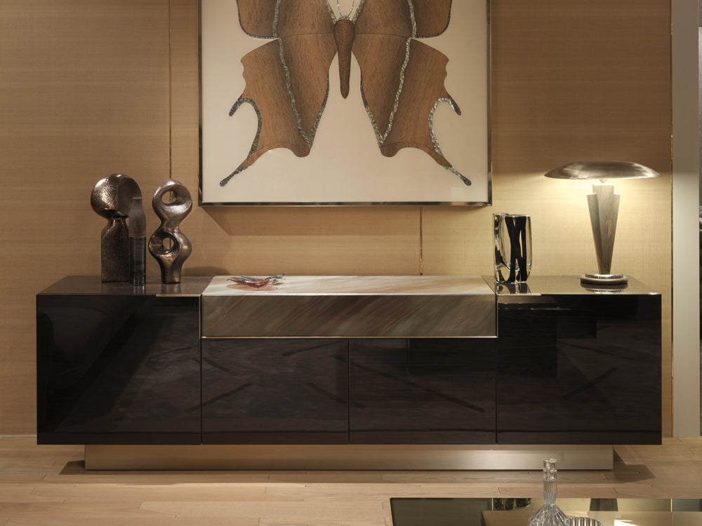 description | Low cabinet in veneered wood with shaped sides and marble top. Four doors in wood and a drawer with mar- ble front with edges coupled to 45°, handles in satin finish100 gloss lacquered wood interior and extra-clear glass shelves th.8mm. Drawer internally lined in microfibre. Base in satined stainless steel. Wooden parts available in the veneer finishings selection, metal parts available in the metal finishing selection. |