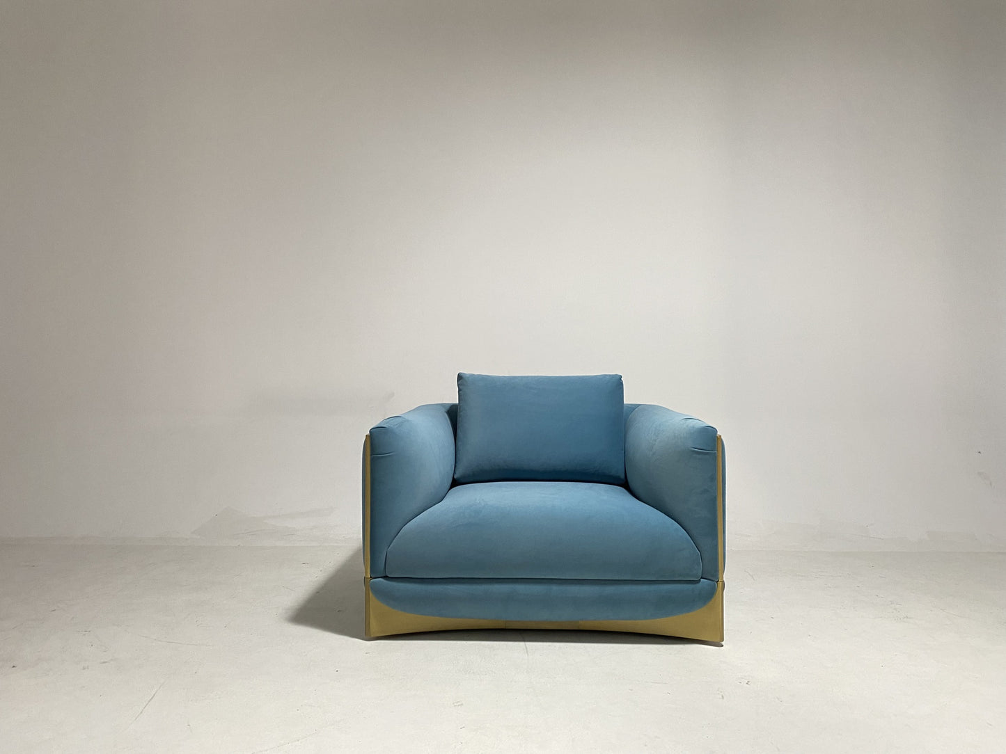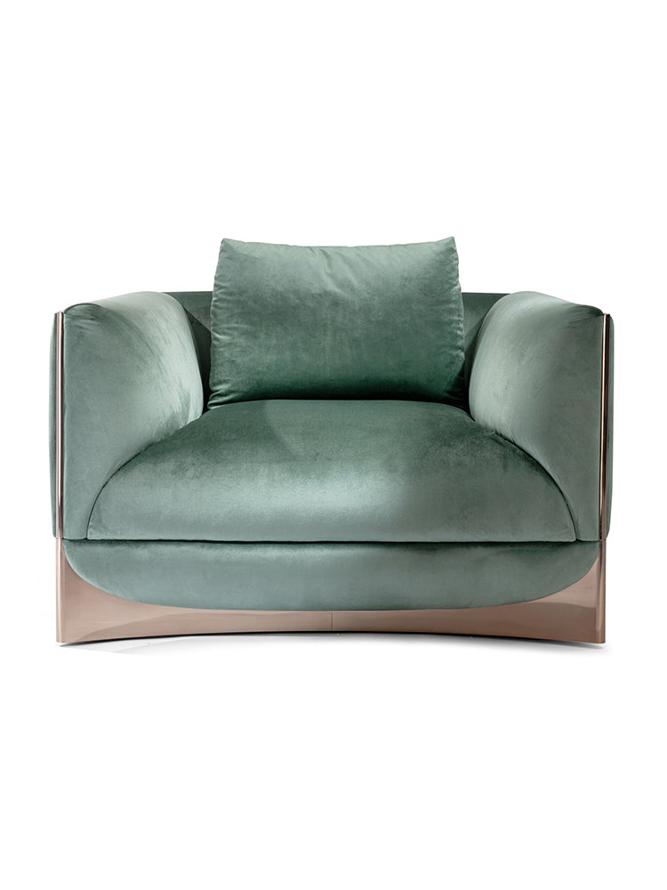 description | Sofa, armchair with non-removable upholstery in leather or fabric, structure in plywood and solid wood with elastic webbing belts. Seats, internal parts of armrests and backrests padded one by one with differentiated density polyurethane foam, Memory Foam® and feather. Loose cushions in feather. Shaped base in wood covered in curved stainless steel with concave profile and shiny finish. Decorative profiles on armrests in shiny steel. Decorative metal elements can be finished with any lacquer of the metal lacquer finish selection |