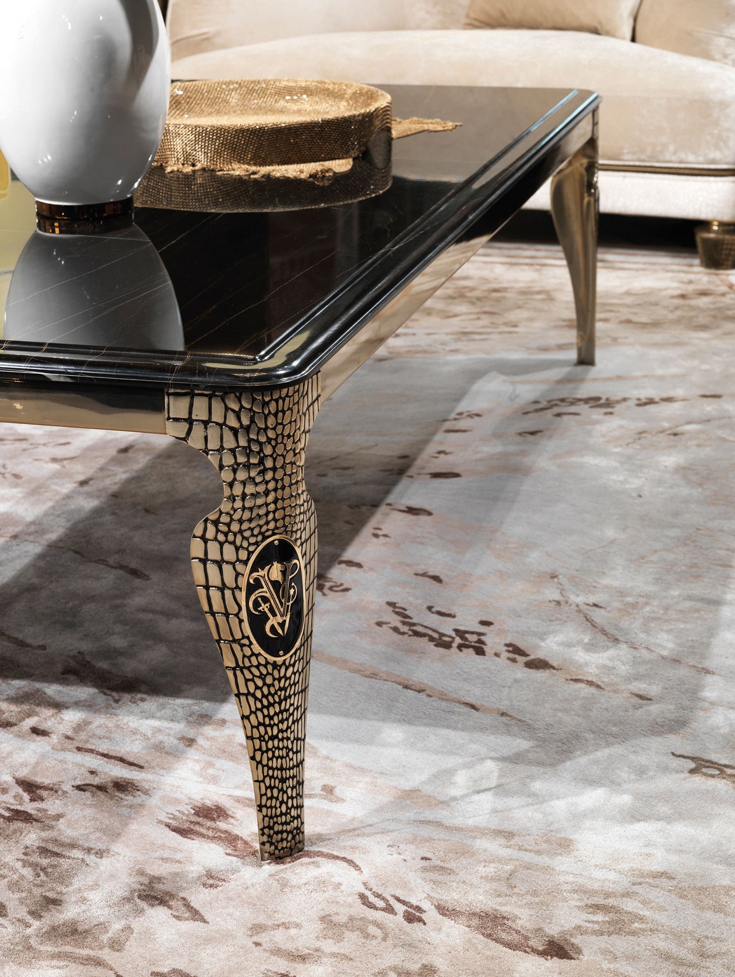 description | Structure in shiny stainless steel with Visionnaire coat of arms in brass, leg in brass with aluminium turnings and insert in blown and grinded crystal, with diamond pattern and with frosted finishing. Undertop in stainless steel and top in bevelled marble. Metal details can be finished with any lacquer of the metal lacquer finish selection. |