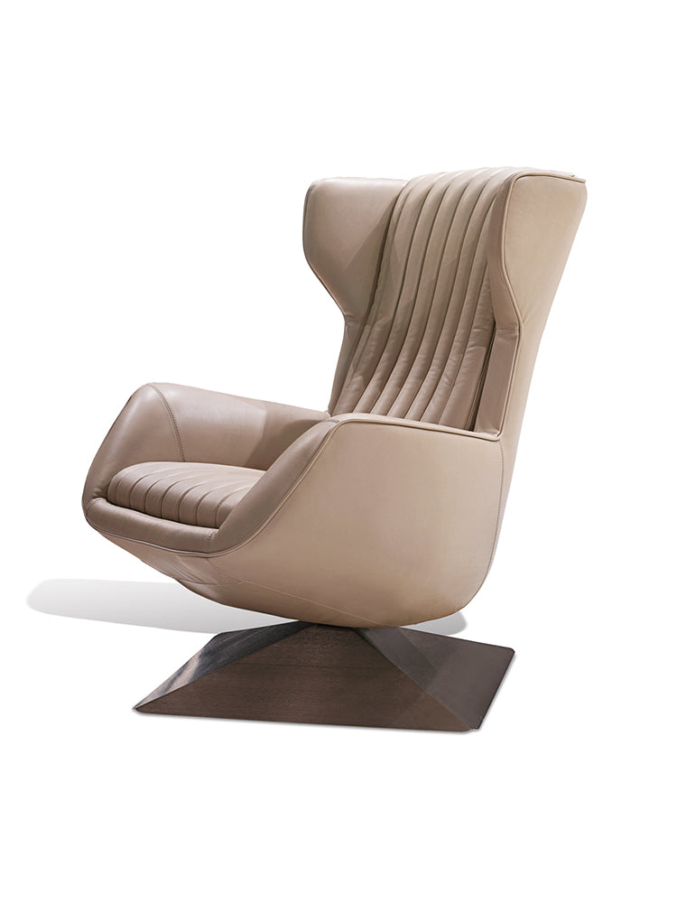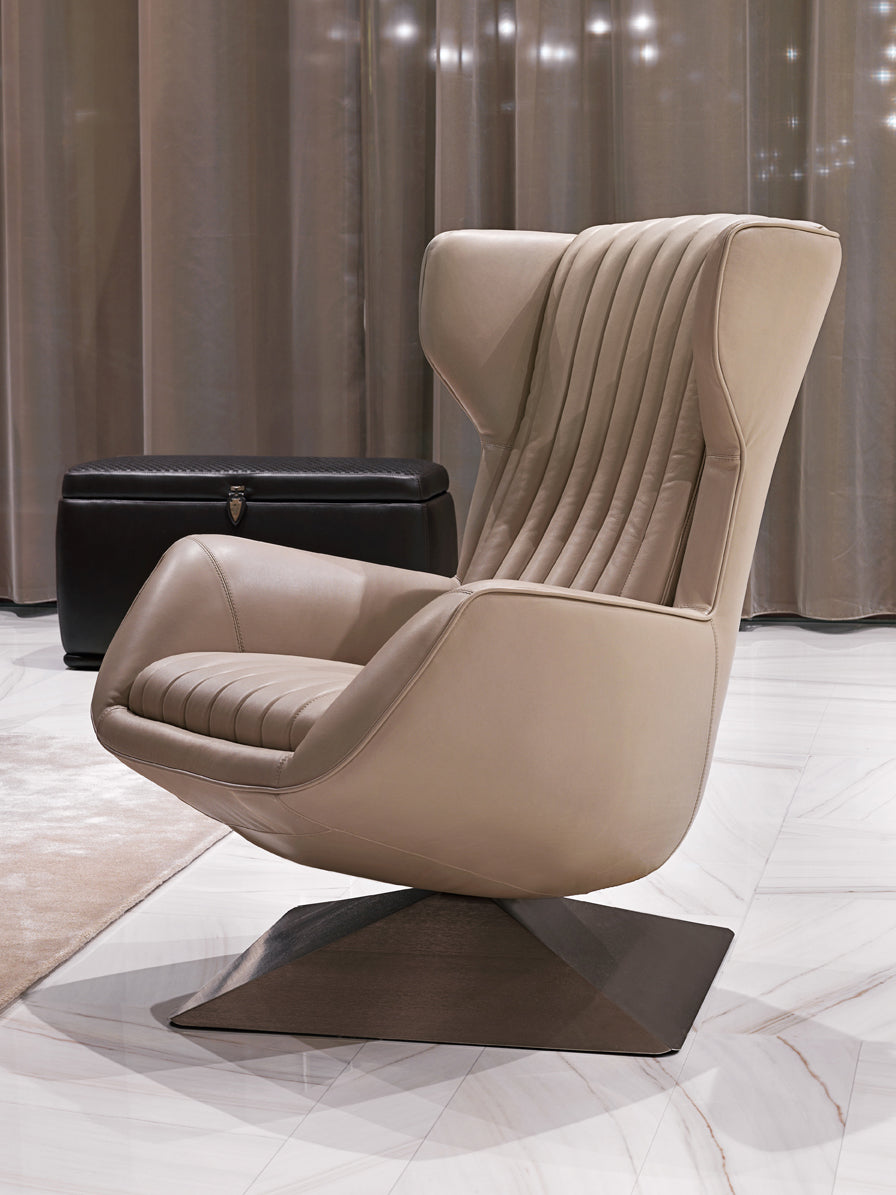 description | Structure in metal, padded and upholstered; backrest and seat in polyurethane in different densities; internal part in quilted Memory Foam®. Upholstery in leather. Seat with spring system with straps. Pyramidal swivel base in metal coated in satinized stainless steel, also available in the available in the metal finishing selection. |