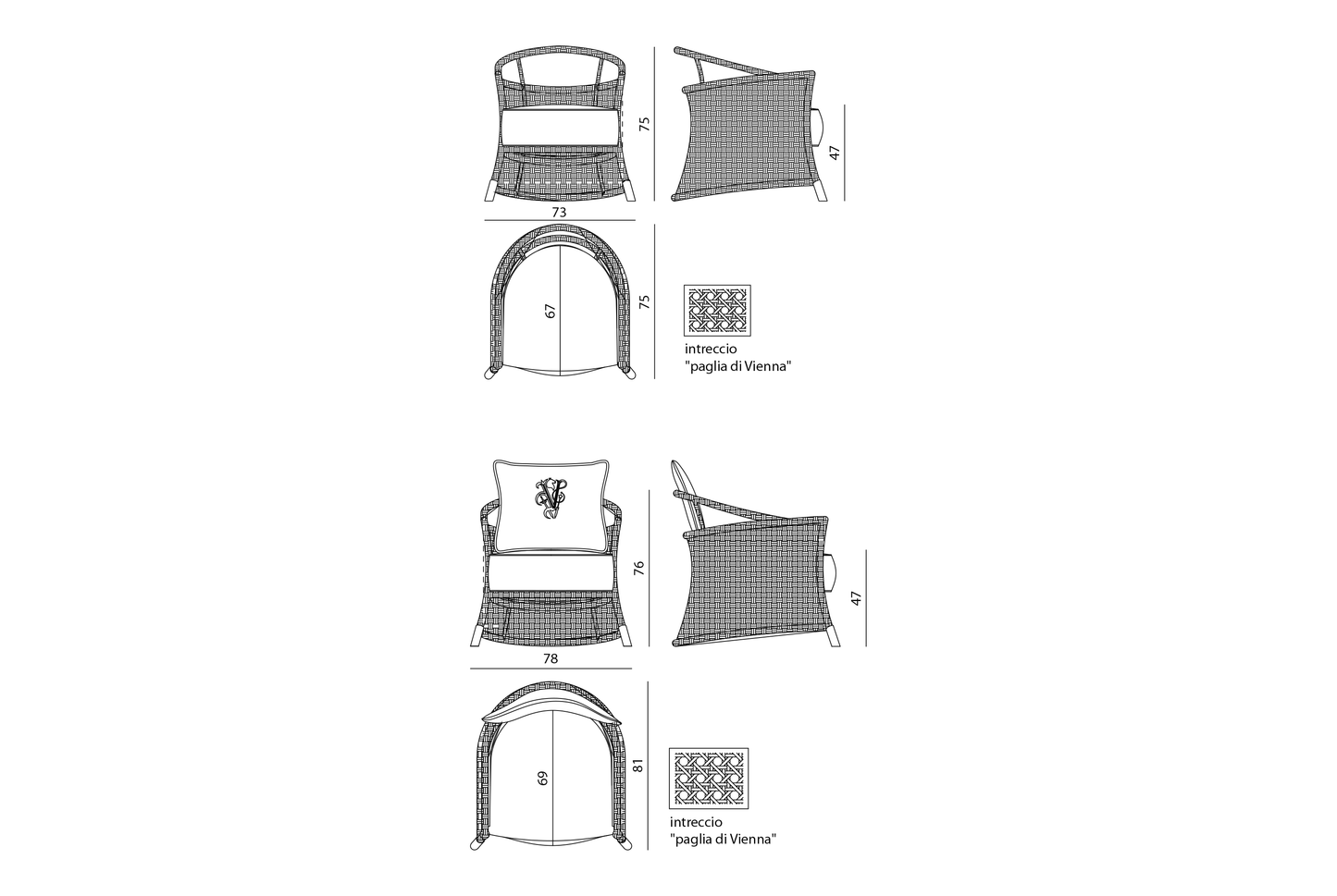 description | Chair in hand-woven synthetic rattan giving a “Vienna straw” pattern effect, frame in aluminium truss. Feet in polished aluminium with transparent protective coating, available with any lacquer of the metal lacquer finish selection. Back cushion in elastic polyurethane and acrylic fibre. Upholstery in outdoor fabric with pipings. Synthetic rattan is available in white gold, honey gold and bronze. |