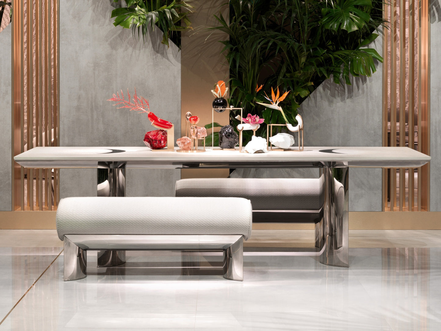 Outdoor dining table. Main structure in polished 316 stainless steel with curved under-top and column-shaped legs designing concave and convex angles. Top in granite or in slab of UH PC/DUCT AL concrete decorated with brass particles. Top decorated with metal inserts in 316 stainless steel only on version with concrete top. |