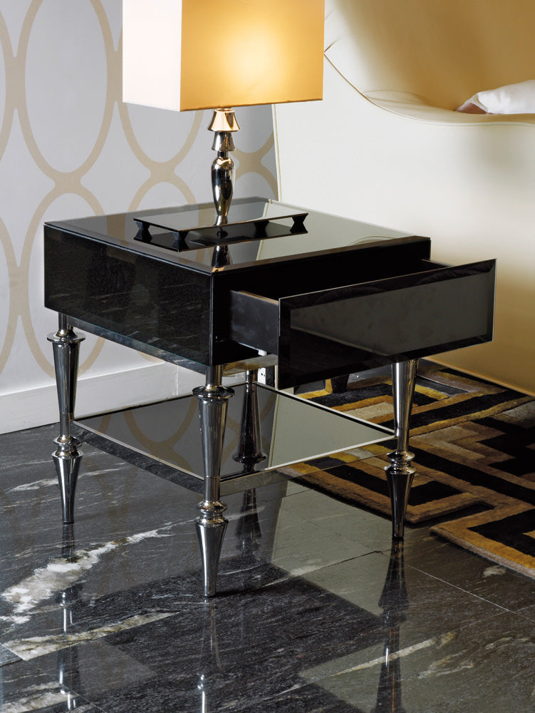 description | Structure in black opaque lacquered MD. Drawer in birch. Covered in bevelled glass, retrolacquered, available in standard colours. Intermediate shelf in retro-lacquered glass. Structure in chromed brass and feet in lathed aluminium, finished in polished chrome. |