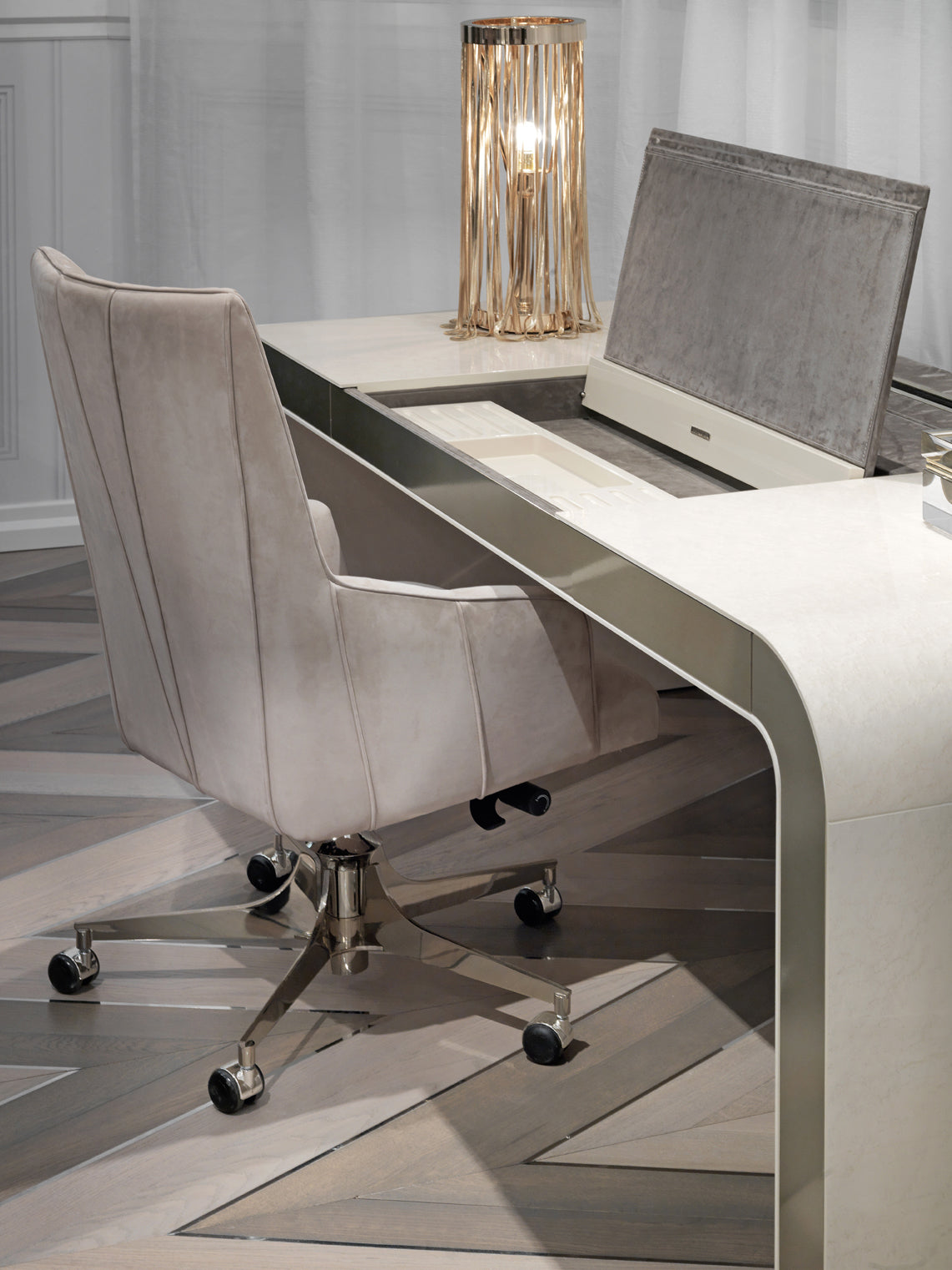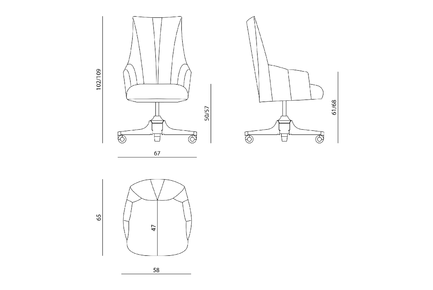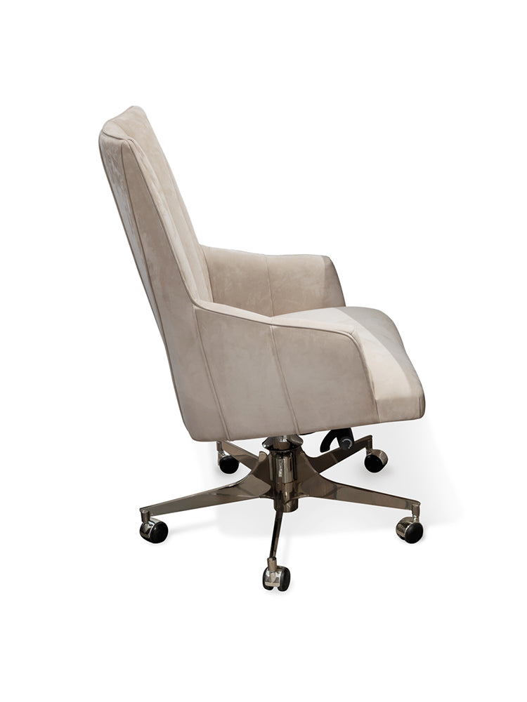 description | Back frame in shaped plywood joined to the seat frame. Seat sprung system with twisted elastic belts. Upholstery in leather or fabric. Seat padding in polyurethane foam. Internal part of the back in polyurethane foam and acrylic fibres, parts padded individually. External part equipped with a 10 mm layer of polyurethane. Base in polished stainless steel with 5 laser-finished spokes, 8 mm in width, with aluminium turnings and chrome wheels, available in the metal finishing selection. |