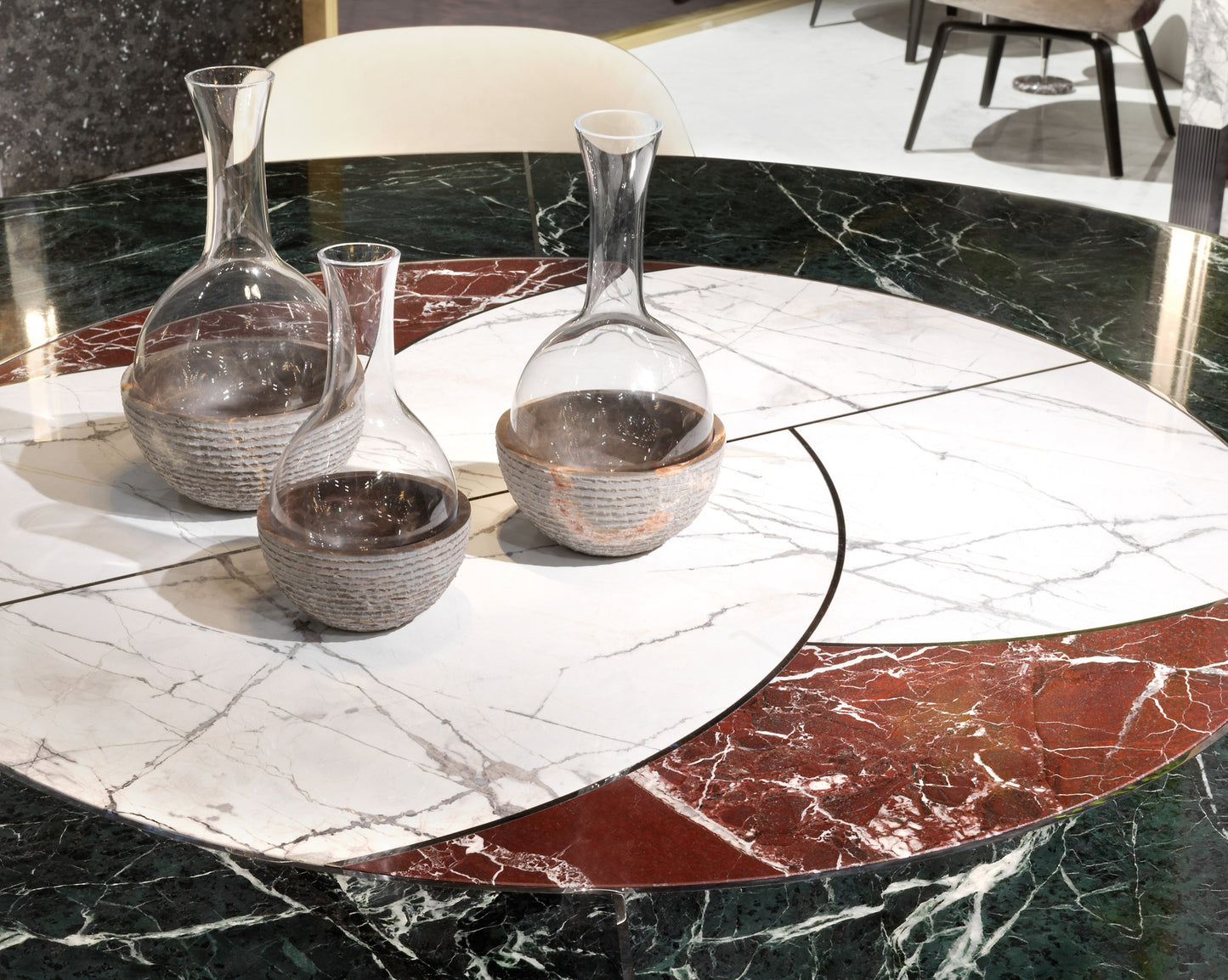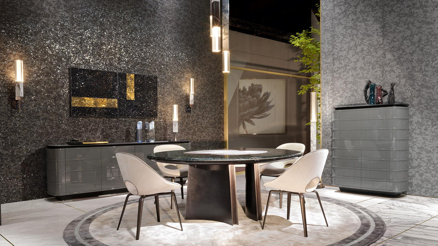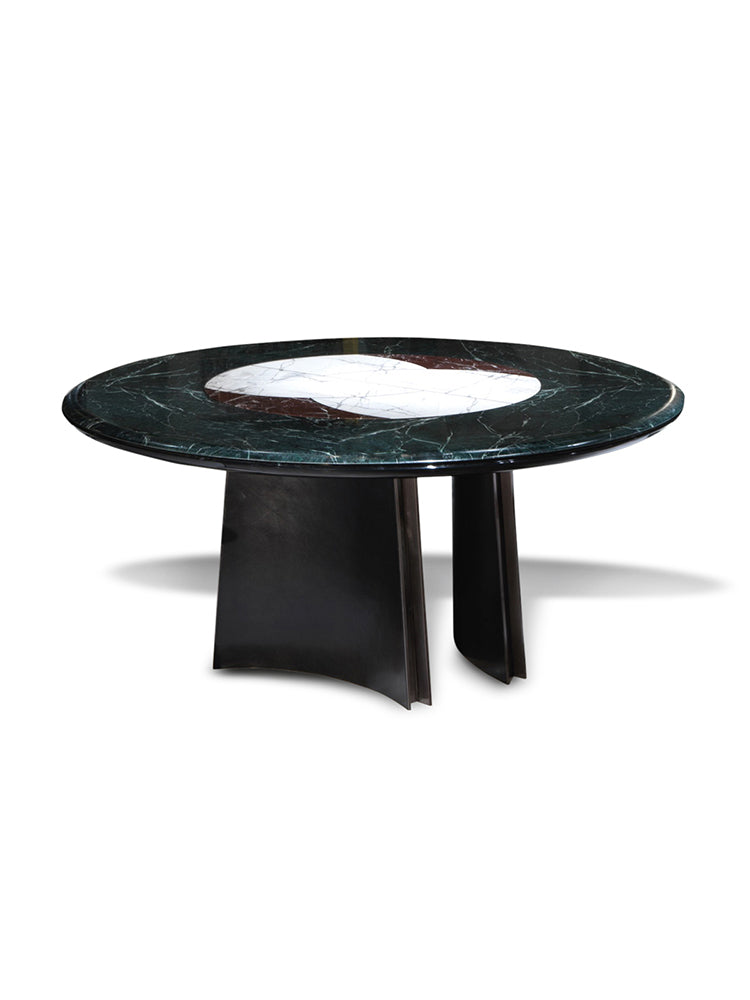 description | Round dining table with marble top composed of a macro-mosaic in three types of marble inlaid with a 5mm metal profile in stainless steel. The edge of the top is worked with a rounded edge. Undermount in glossy lacquered wood with rounded section. Base made of three concave wooden legs covered in black leather with decorative profiles in stainless steel. Available with turning “Lazy Susan” built in the top or removable leant on it. The metal parts of the base are available in the metal finishing selection. Available JASON RADICA version with concave legs upholstered in burr walnut with decorative profiles in satin-finished stainless steel. |