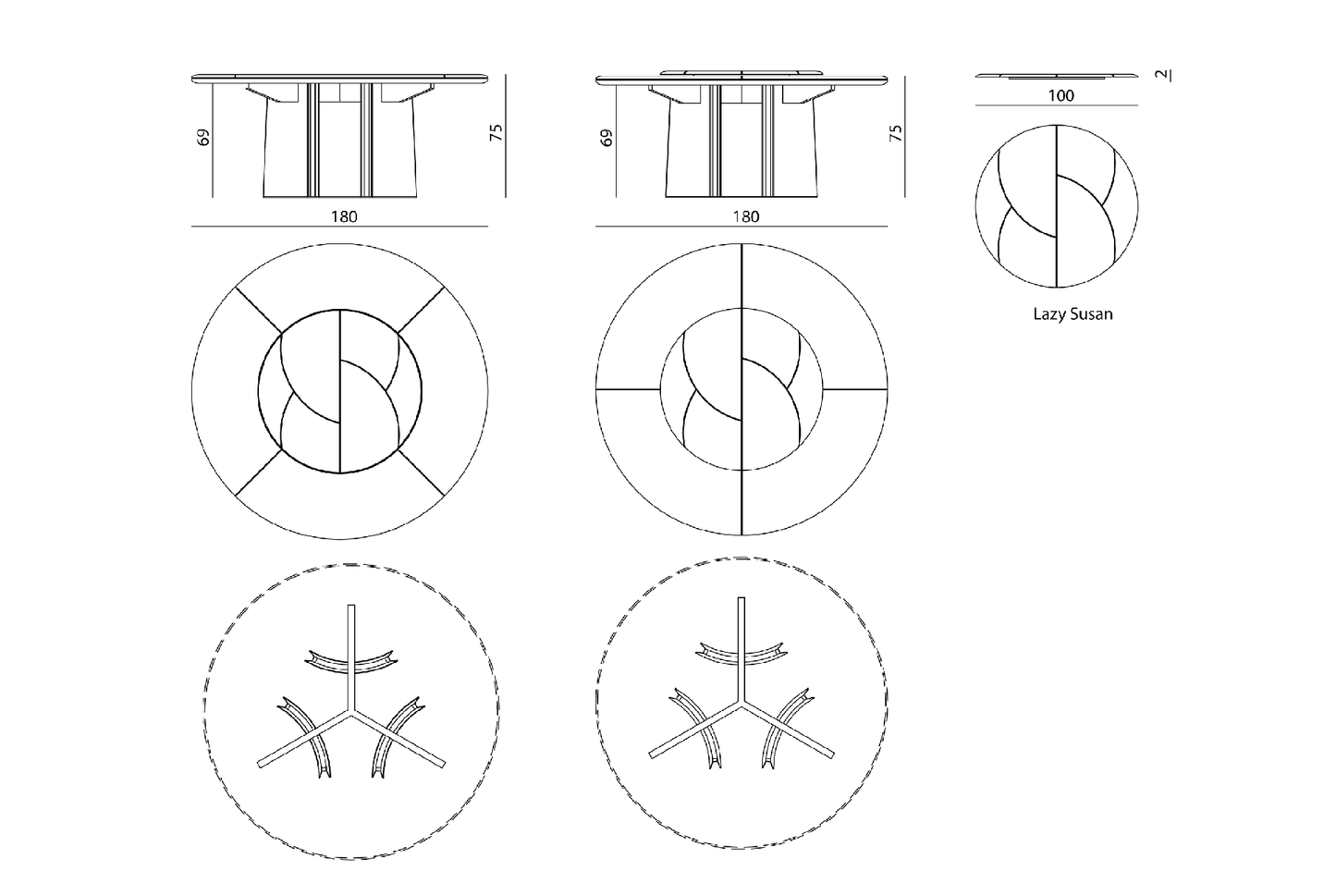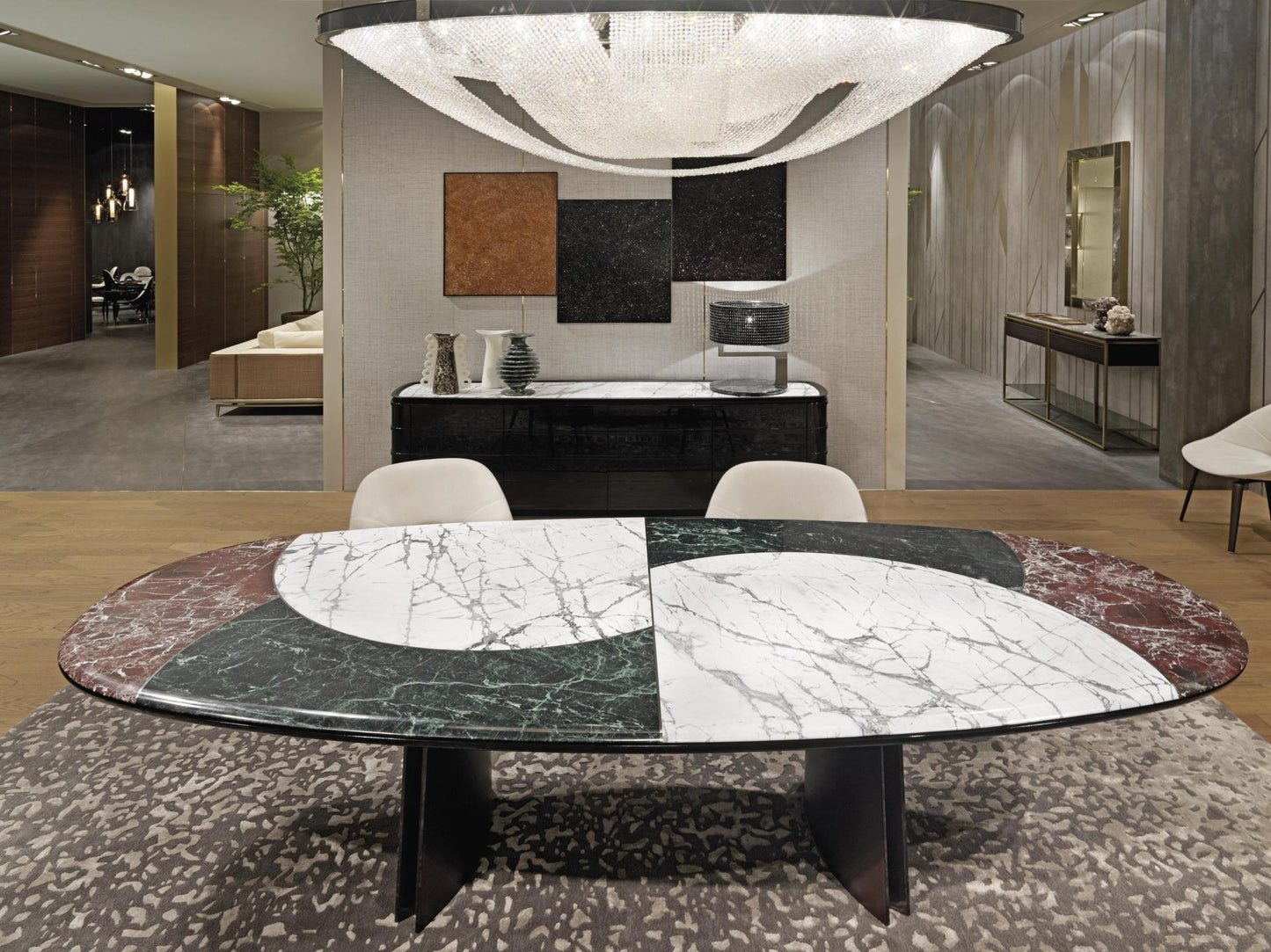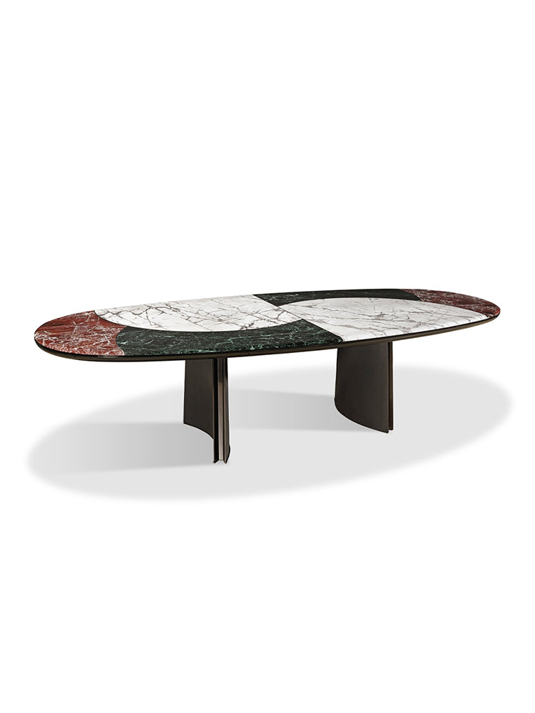 description | Round dining table with marble top composed of a macro-mosaic in three types of marble inlaid with a 5mm metal profile in stainless steel. The edge of the top is worked with a rounded edge. Undermount in glossy lacquered wood with rounded section. Base made of three concave wooden legs covered in black leather with decorative profiles in stainless steel. Available with turning “Lazy Susan” built in the top or removable leant on it. The metal parts of the base are available in the metal finishing selection. Available JASON RADICA version with concave legs upholstered in burr walnut with decorative profiles in satin-finished stainless steel. |