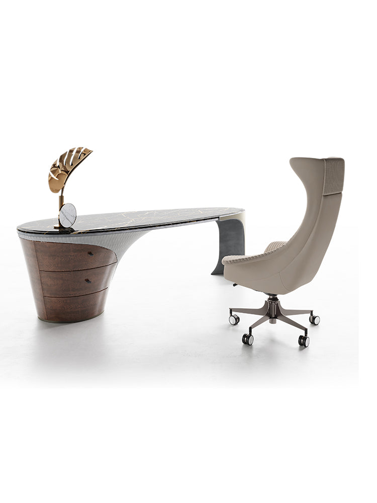 description | Writing desk upholstered in leather with marble top. Main structure in shaped wood internally upholstered in leather, alternating plain and lozenge quilted sections; desk equipped with two drawers with handles in leather and brass and cable guide. Supporting leg in shaped wood, internally upholstered in leather and externally covered in curved stainless steel with satin finish. Oval top in bevelled and polished marble, or in lacquered wood (RAL/NCS colours), with integrated cable guide. Metal parts can be finished with any lacquer of the metal lacquer finish selection. Available in JET PLANE RADICA version with burr walnut drawers with 100 gloss finish and under-top with lozenge embroidery, with matching top in burr walnut or marble. |