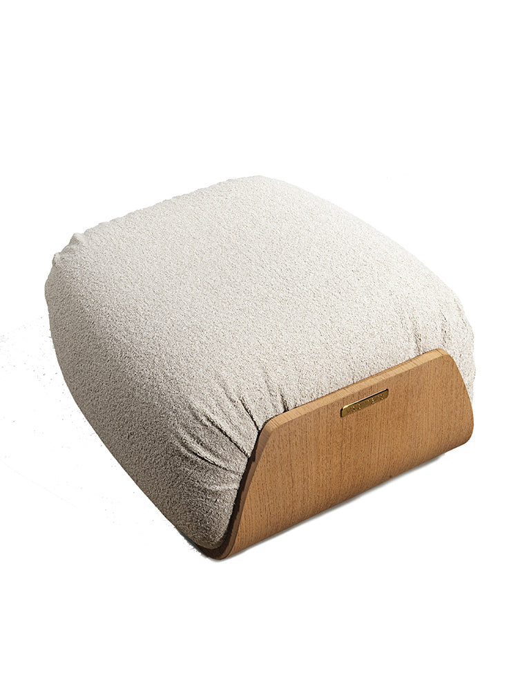 description | Outdoor pouffe, base structure in curved marine plywood covered with teak containing a seat cushion in polyurethane foam in different densities, upholstered in fabric or leather for outdoor use. |