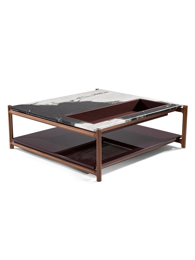 description | Low table. Supporting frame in Canaletto walnut solid wood with open-pore natural finish and shaped three-lobes section. Lower shelf in wood with shiny RAL/NCS lacquer finish or upholstery in leather/fabric. Top in marble available with optional storage tray upholstered in leather or fabric. |