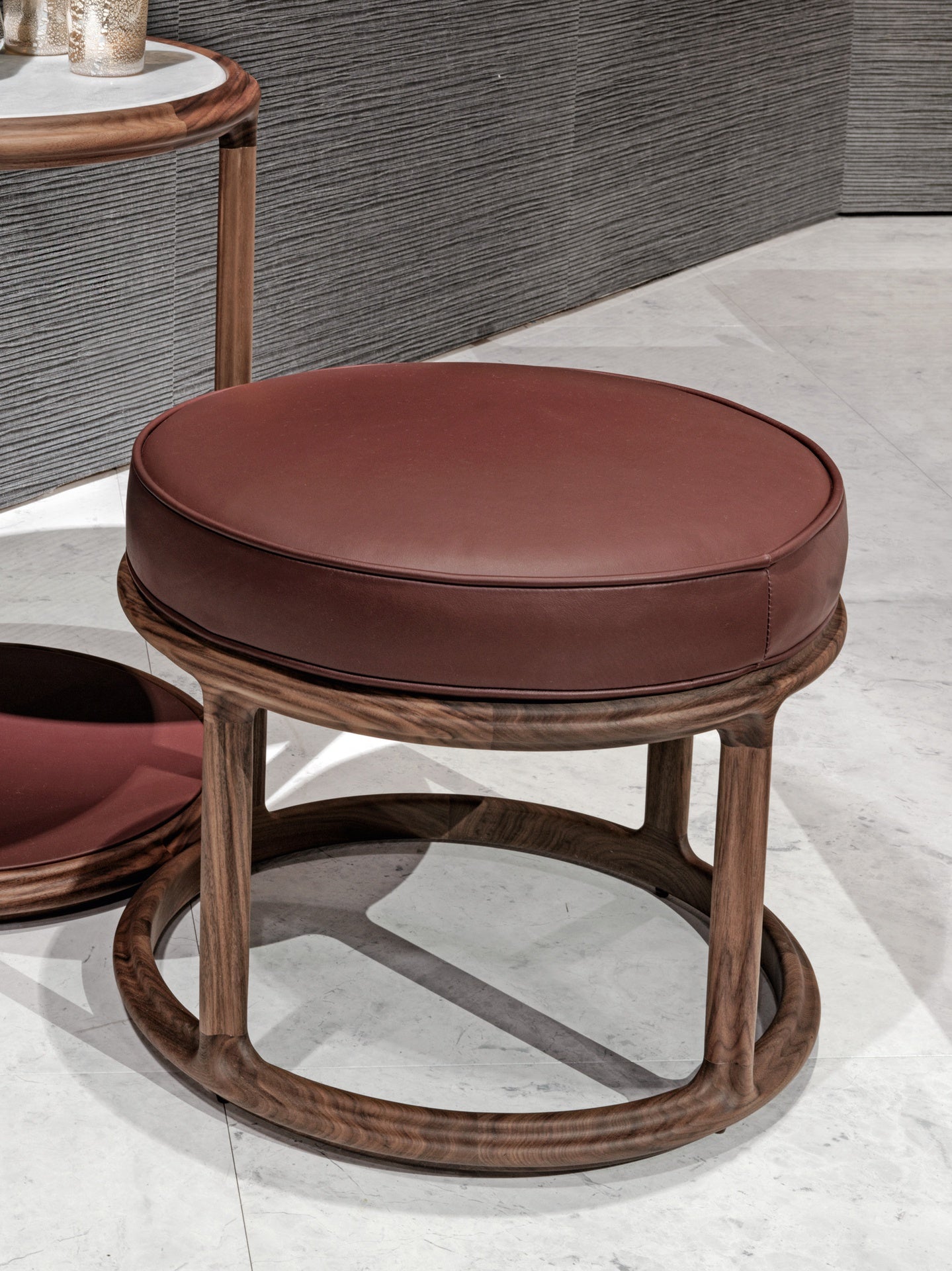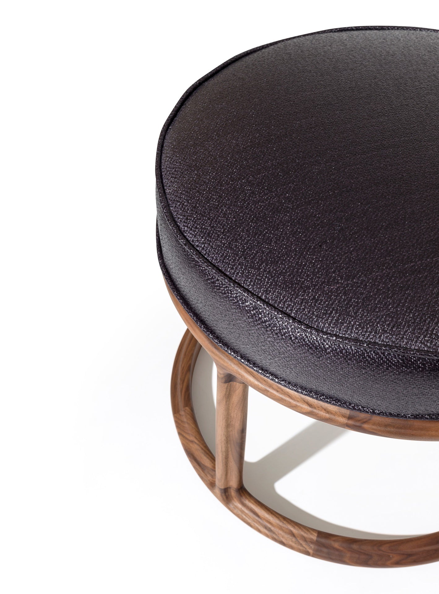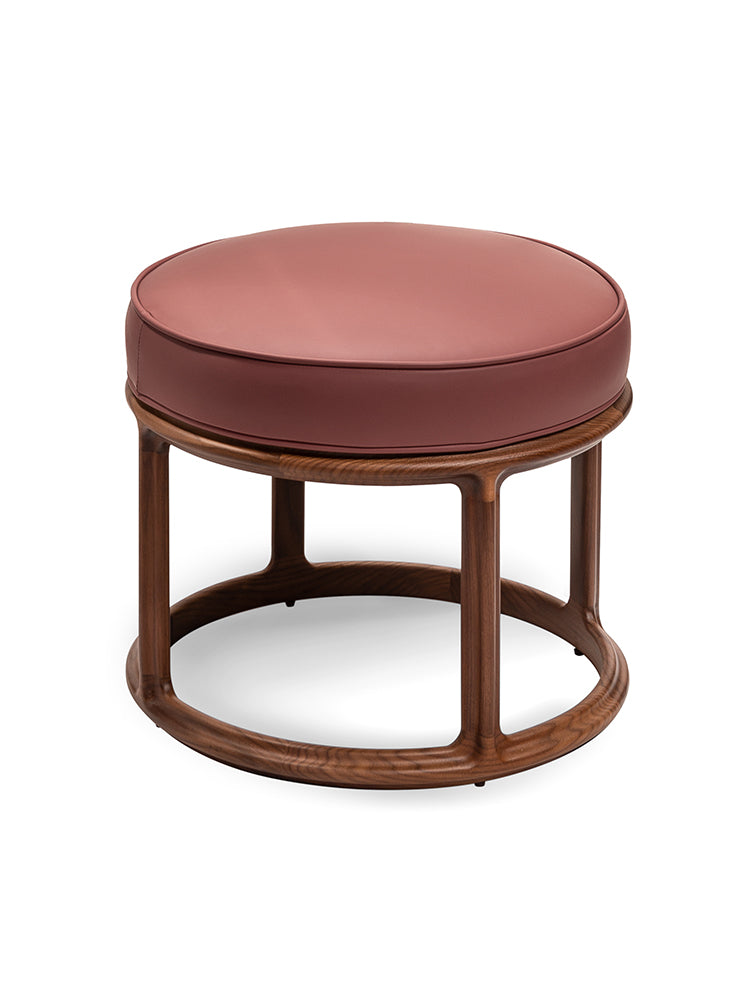 description | Stool/pouffe. Main frame in Canaletto walnut solid wood with open-pore natural finish and shaped three-lobes section. Seat with polyurethane padding and upholstery in leather or fabric. |