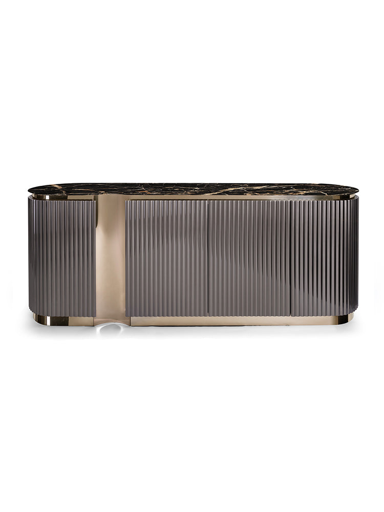 description | High unit with four doors with shaped sides; structure in wood with plinth, under-top profile and supporting pillar covered in polished curved stainless steel, with convex and concave shapes. Doors and sides decorated with ‘canneté’ stripes carved in low relief, available with: shiny lacquer (RAL or NCS colours) finish; metal colours as per sampler; upholstery in Soft leather. Drawers internally finished with matt RAL/NCS lacquer. Decorative profiles in curved stainless steel, with optional finish in any lacquer of the metal lacquer finish selection. Counter top in polished marble with bevelled lower edge. Optional: internal LED lights. Available in the LEONARDO RADICA version with smooth doors and curved sides in briarwood with a 100 gloss finish. |