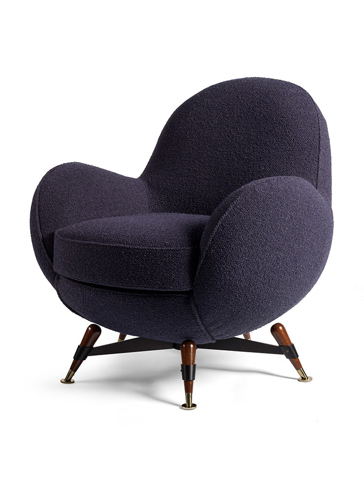 description | Armchair upholstered in elastic fabric. Main structure in solid wood and plywood. Seat equipped with elastic spring belts. Padding in polyurethane foams with different densities and acrylic fiber. The base consists of a five spokes star in black steel and feet in solid wood with tips in brass lacquered in any colour of the polish metal finish selection. |