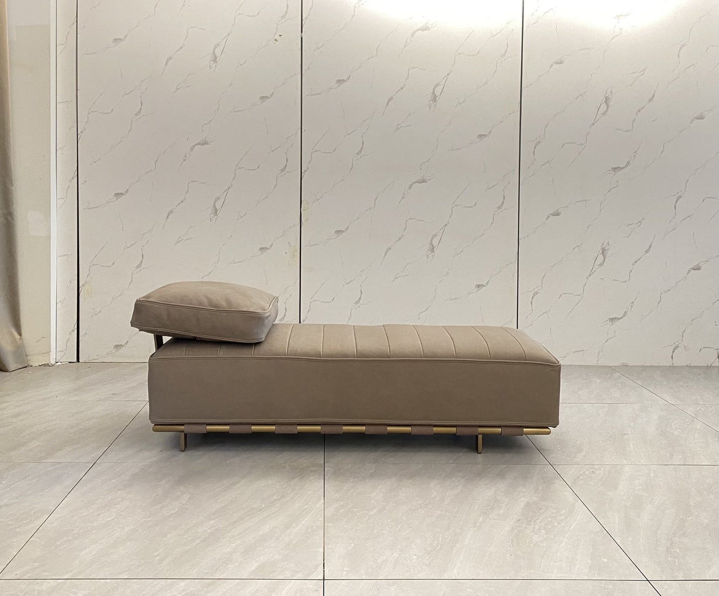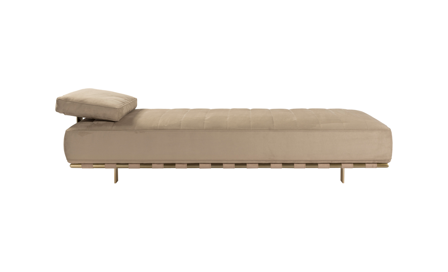 description | Sofa upholstered in leather or fabric, structure in wood with elastic spring belts, aluminium feet connected by means of crews to a frame in tubular metal with conic section, decorated with belts in leather or fabric Faber, gand, Kale, Eco-Skin. External structure in solid wood and plywood padded in polyurethane foam with different densities. Headrest padded in polyether and acrylic fiber, internal metal structure with adjustable inclination. Seat cushions and armrests in polyrethane foam, Memory Foam® and feather. When upholstered in fabric, piping and belts can be made in fabric Faber, Gand, Kale or Eco-Skin, or in Soft leather, metal parts available in the satinized metal finishing selection. |