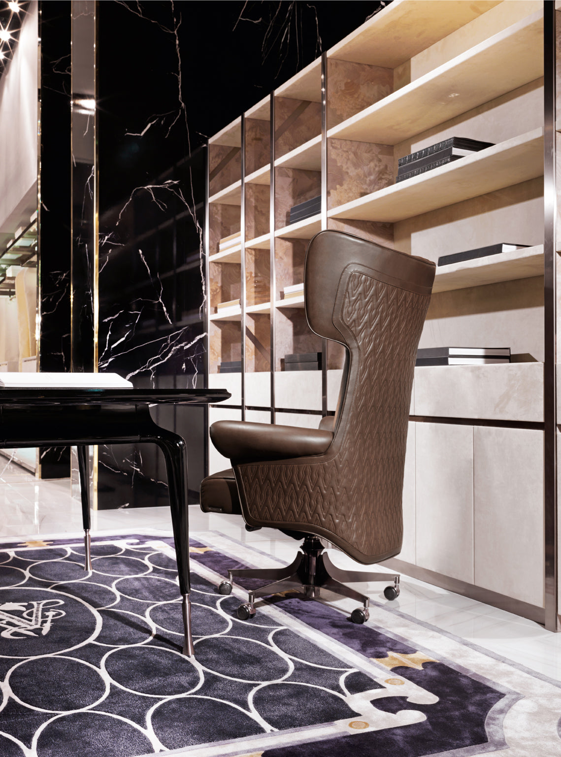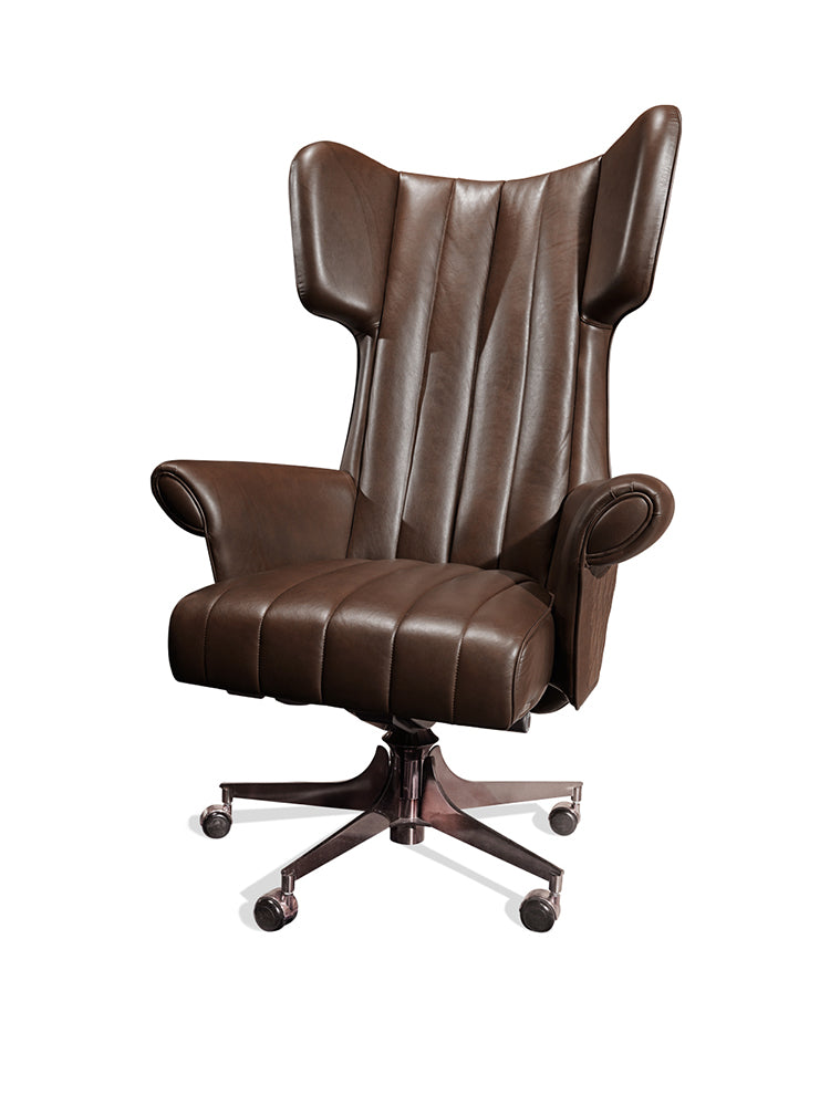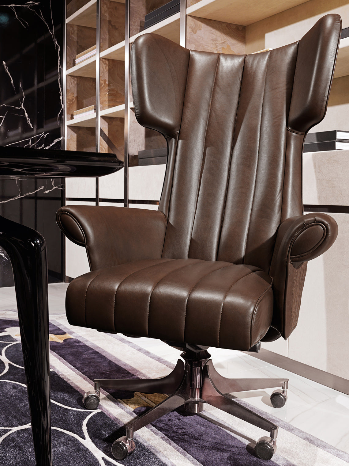 description | Structure in shaped plywood and solid wood, padding in polyurethane foam and spring system with straps, upholstery in leather or fabric. High back padded in polyurethane foam and acrylic fibres, portions padded individually; external part decorated with embroidery in relief, creating a geometrical pattern. Base in stainless steel with 5 laser-cut spokes, with wheels and turnings in aluminium, available in the metal finishing selec-tion. Swivel shock absorber piston, adjustable in height, with lockable reclining system. |