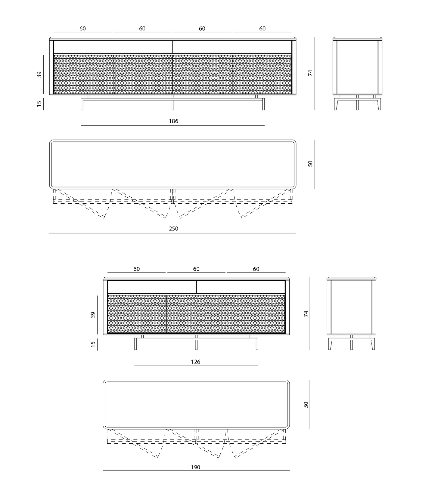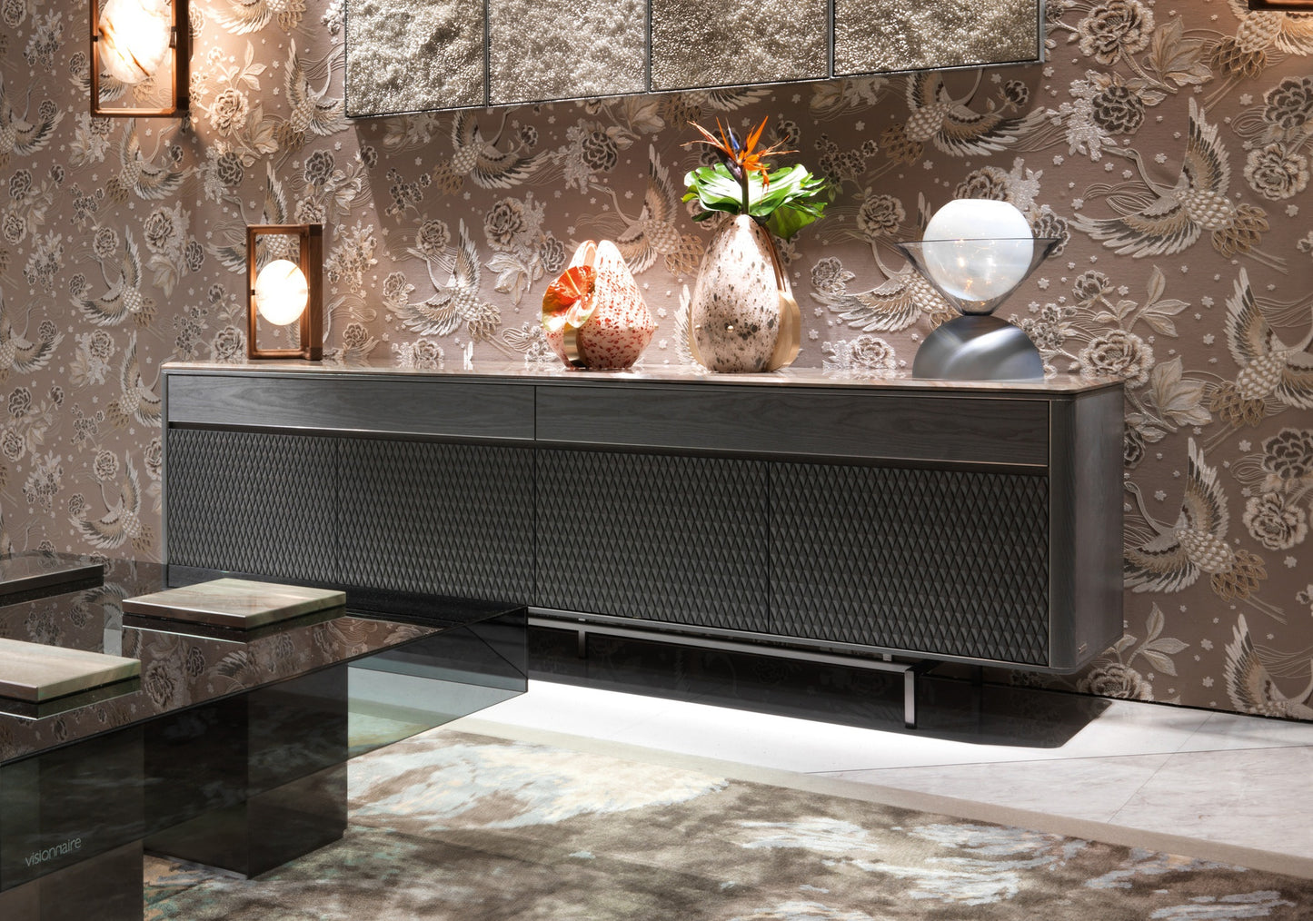 description | Low cabinet with four doors and two drawers. Structure in MDF covered in wood with inserts in satin stainless steel embedded in the wood. Wooden doors carved in low relief with diamond pattern, marble top. Base with feet in brushed stainless steel, matt lacquered interior, matt lacquered back, optional available veneered. The wooden parts are available in matt finishes B.180, B.181, B.182, C.001. Metal parts available in the satinized metal finishing selection. Available in PARKER RADICA version with drawer front and main structure in briarwood with 100 gloss finish, doors in glossy lacquered wood (RAL/NCS colours). |