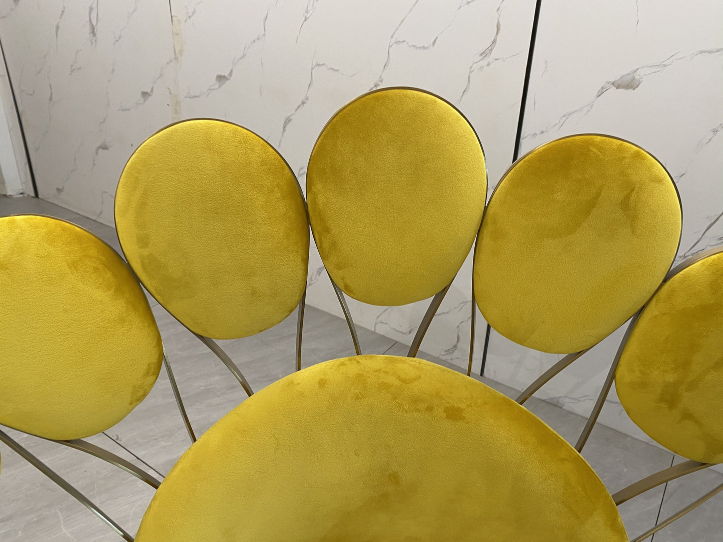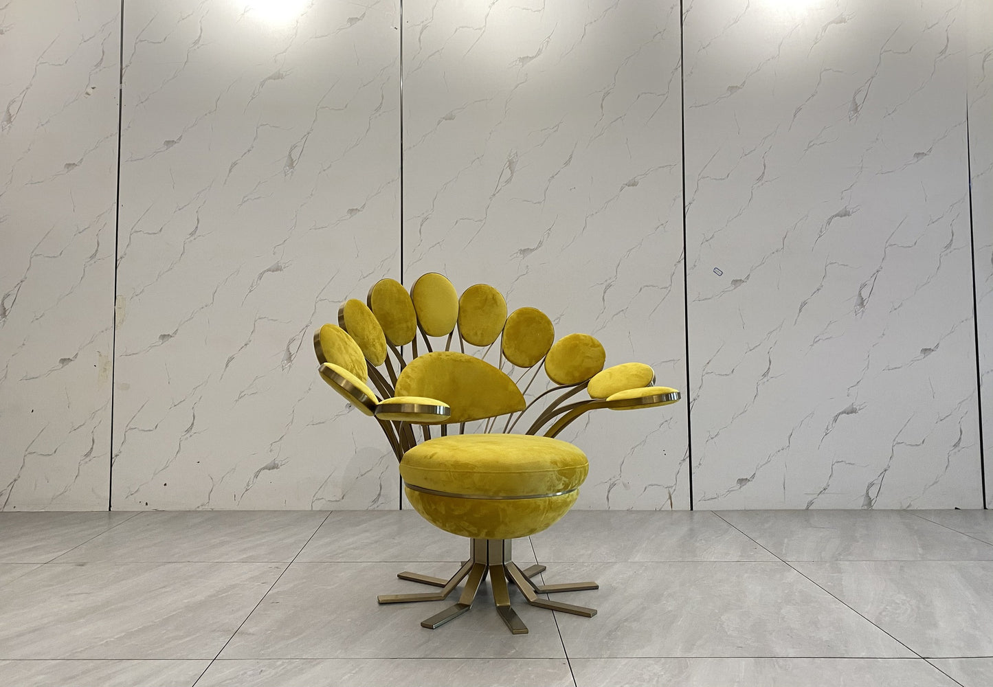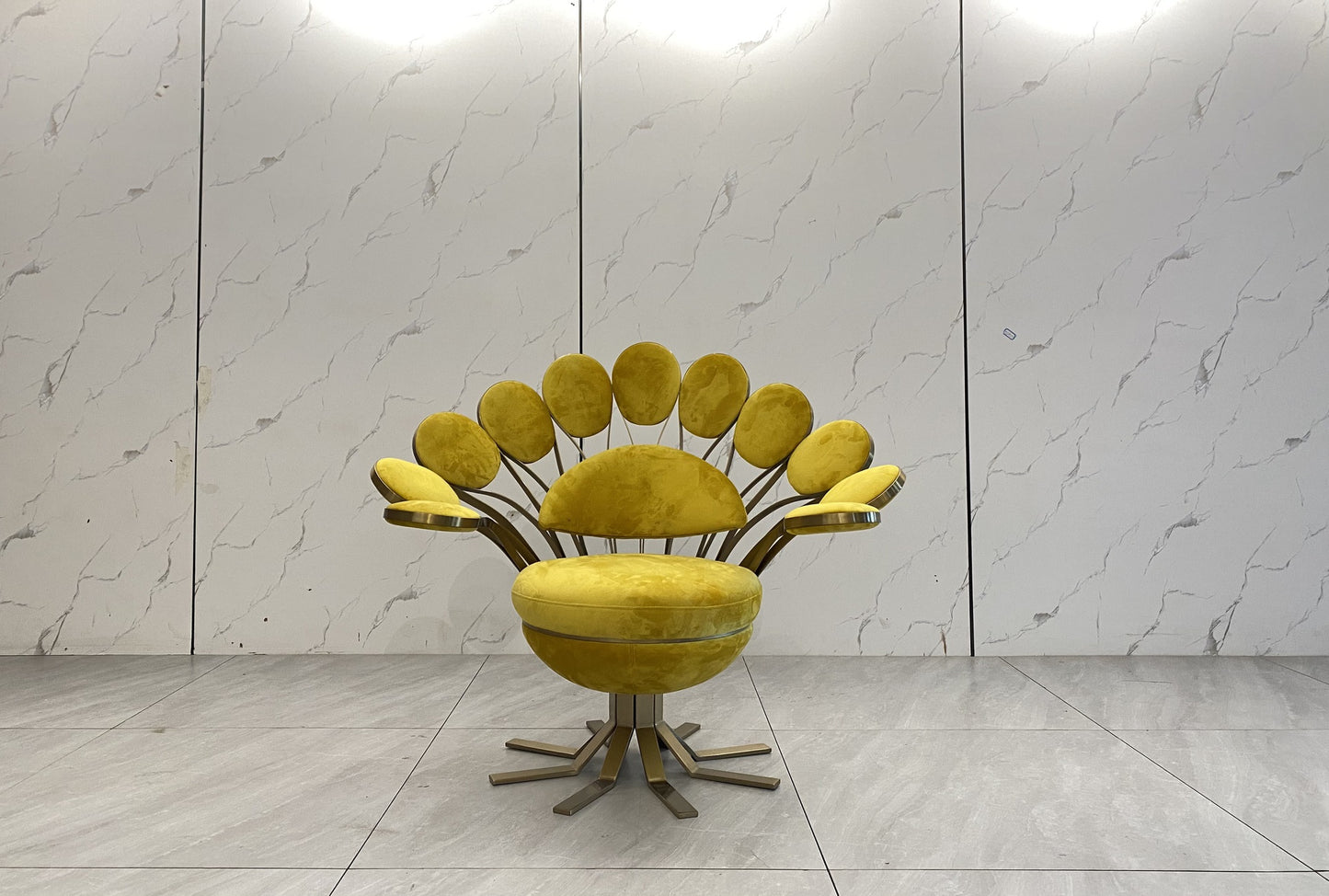 description | Armchair in leather or fabric, external structure in brass and steel, armrests and backrest consist of elements shaped like a corolla of petals, made in cast brass with hand-polished finish and with upholstered pads. Seat and small back cushion padded in polyurethane foam with different densities and acrylic fibre. Lower seat structure in wood, covered in leather, and base in chromed metal. Metal parts can be lacquered in any colour included in the metal finish selection. |