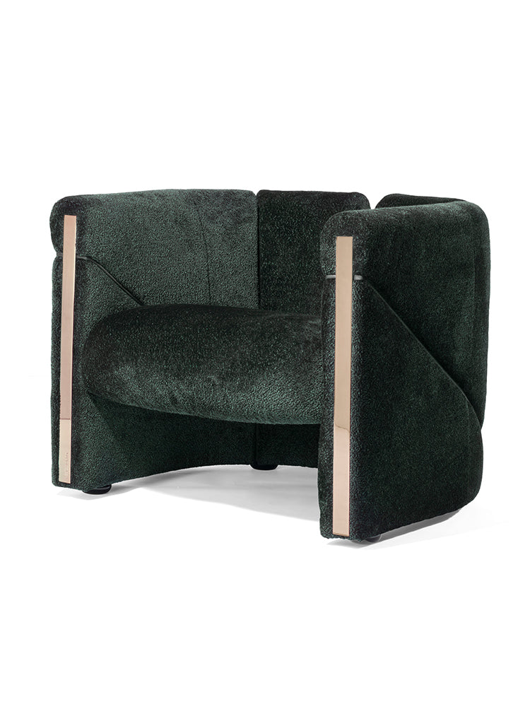 description | Armchair in leather and fabric, external structure in curved wood equipped with elastic spring belts. Backrest and armrest provided with vertical structural elements in stainless steel. External structure upholstered with a geometrical pattern and piping in Soft leather. Metal parts can be lacquered in any colour included in the metal finish selection. |