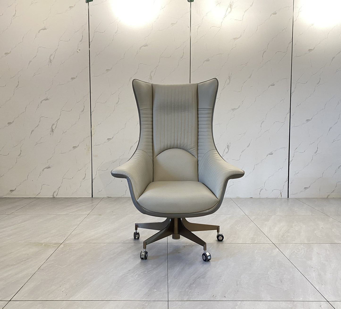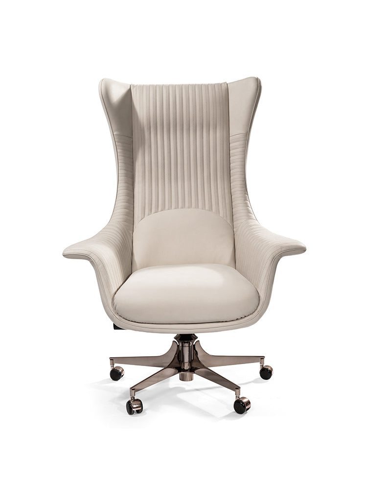 description | Supporting frame in shaped plywood and solid wood; seat with elastic belt spring system. Seat and armrest padding with different densities. Upholstery in leather, armrests and backrest cover decorated with quilted embroidery and perforation pattern. Curved external structure upholstered in leather. Base in stainless steel with 5 wheels, turnings in aluminium. Rotary piston damper with self-locking drive system and adjustable height. Base can be finished with any lacquer of the metal lacquer finish selection. |