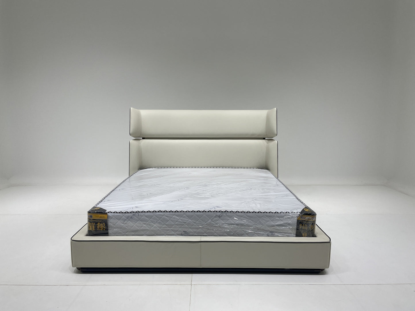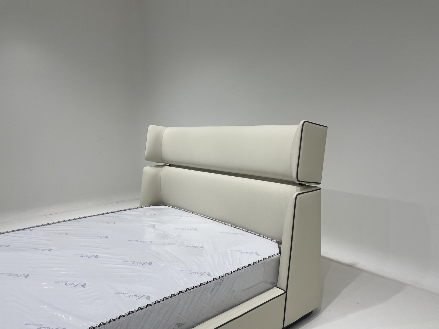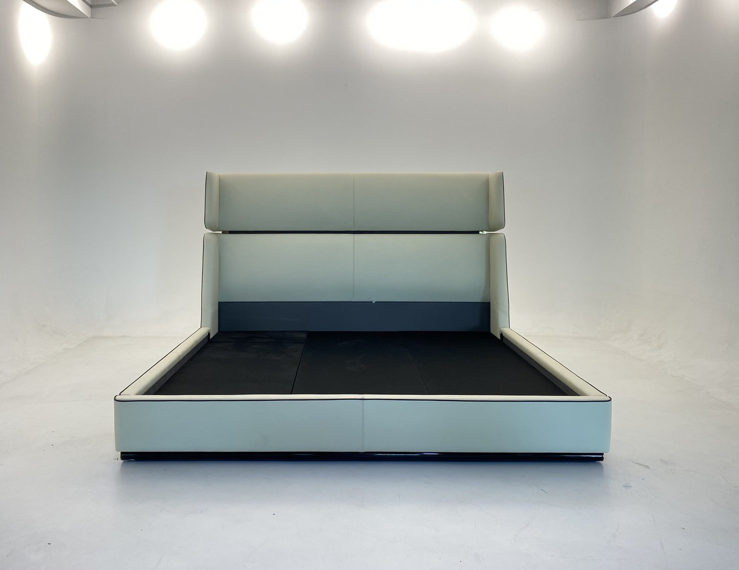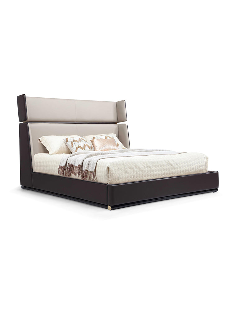 description | Upholstered bed in leather or fabric with high head divided into two horizontal sections with different inclination. The external part can be covered in contrast with the inner part, divided by a leather thread. Padded sommier with inwardly inclined bed frame; polished lacquered wooden base with decorative satin brass corners. Internal structure in solid and multilayer wood, solid wood slatted base. Height adjustable slats/mattress supports. Metal parts available in the metal finishing selection. Available in RÊVERIE RADICA version with burr walnut outer shell in 100 gloss finish. Shown with bed linings, pillows and bedcover: Chambre Cinq. |