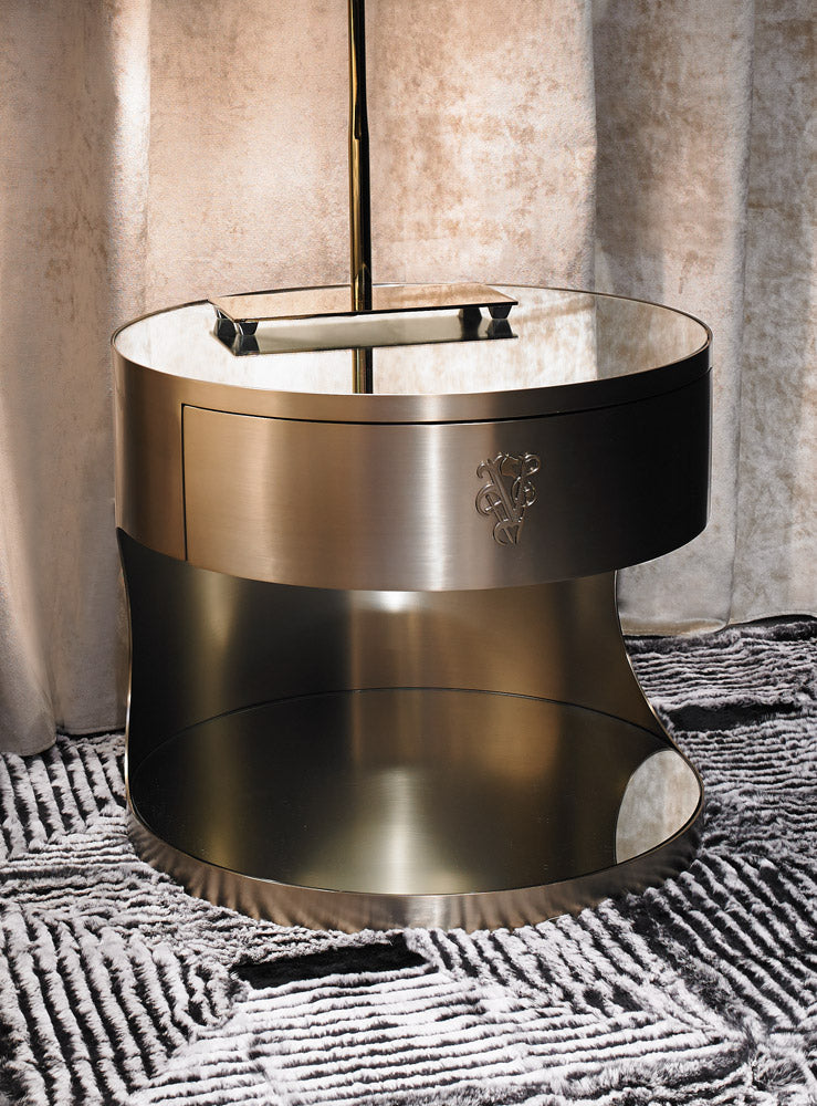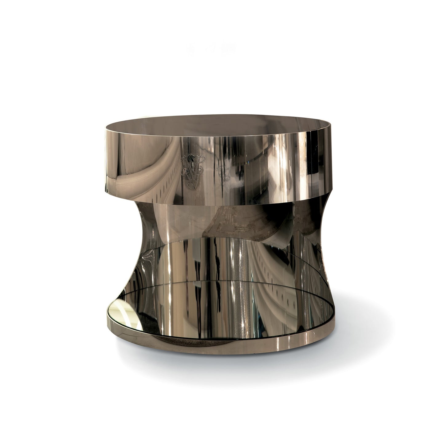 description | Structure in stainless steel laminate th. mm 3. Drawer with structure in mat lacquered wood and front in stainless steel laminate, with Visionnaire logo decoration in pierced brass. Top and base in lacquered glass, available in the standard colours or in mirror. Metal parts available in the metal finishing selection. |