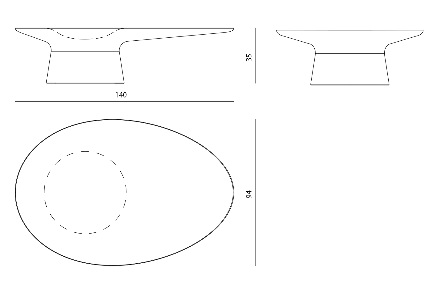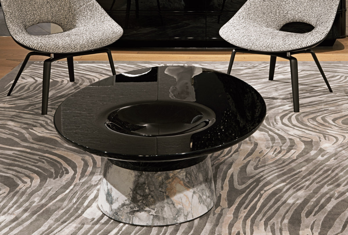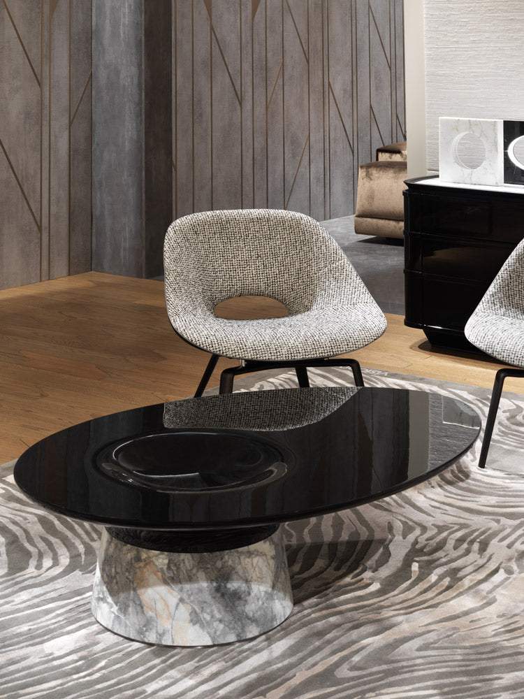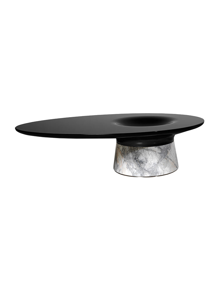 description | Oval low table with top in wood fibergraven organic form with 100 gloss lacquered finish. Object compartment in the top. The lower part, of eccentric shape, flows into a conical base in solid marble, milled from a single block. Support base in brushed steel. |