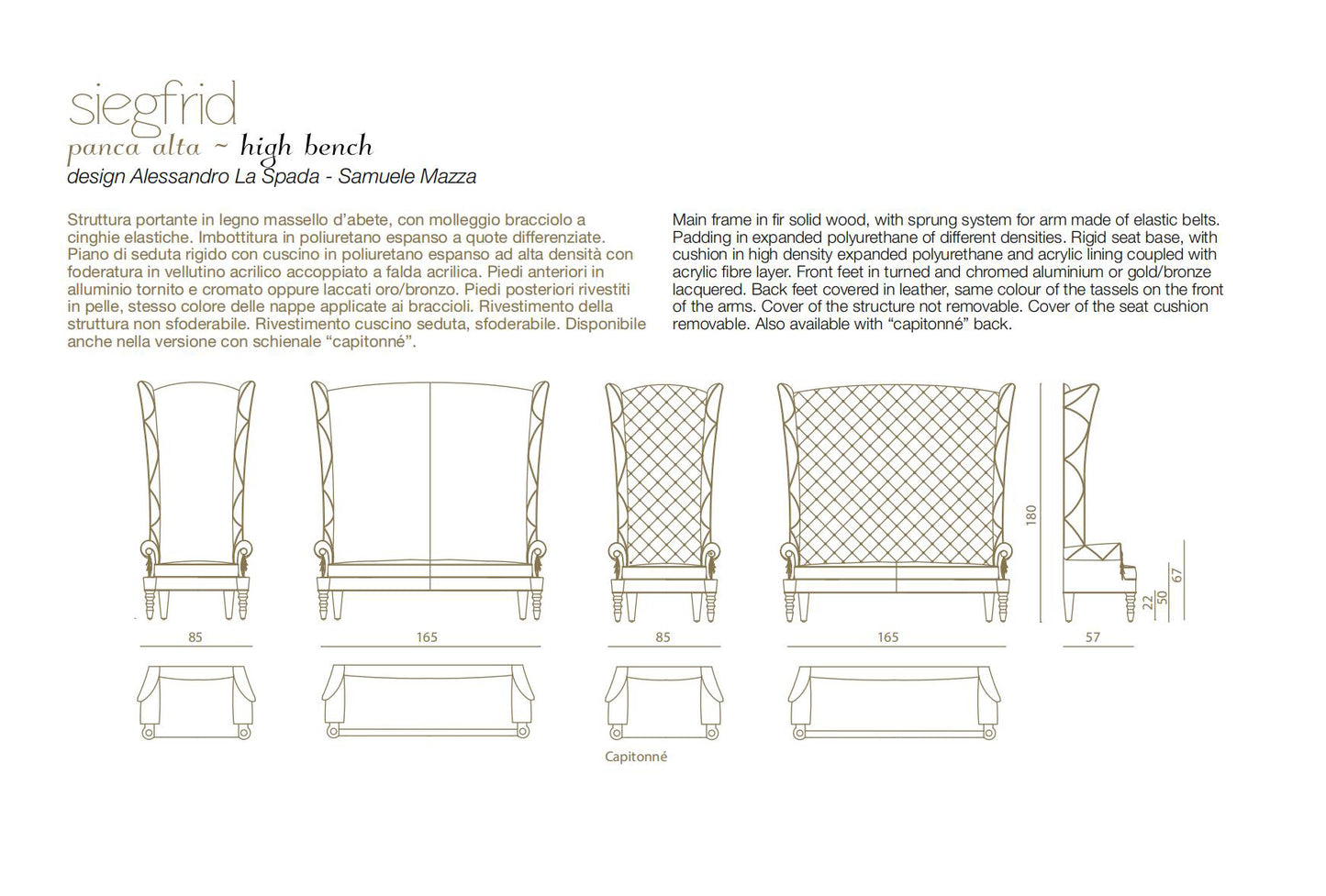 description | Main structure in solid beechand poplar and fir plywood. Seating sprung system with elastic belts. Padding for backrest, armrest and seat cushion in polyurethane foam, different densities. The polyurethane is covered with an acrylic layer. Head of table chair upholstered in leather of fabric with possibility of capitonné finishing on the backrest. Decorative pipings in leather. Cover not revomable. Front legs in turned chromed or golden/brass aluminium and back legs upholstered. |