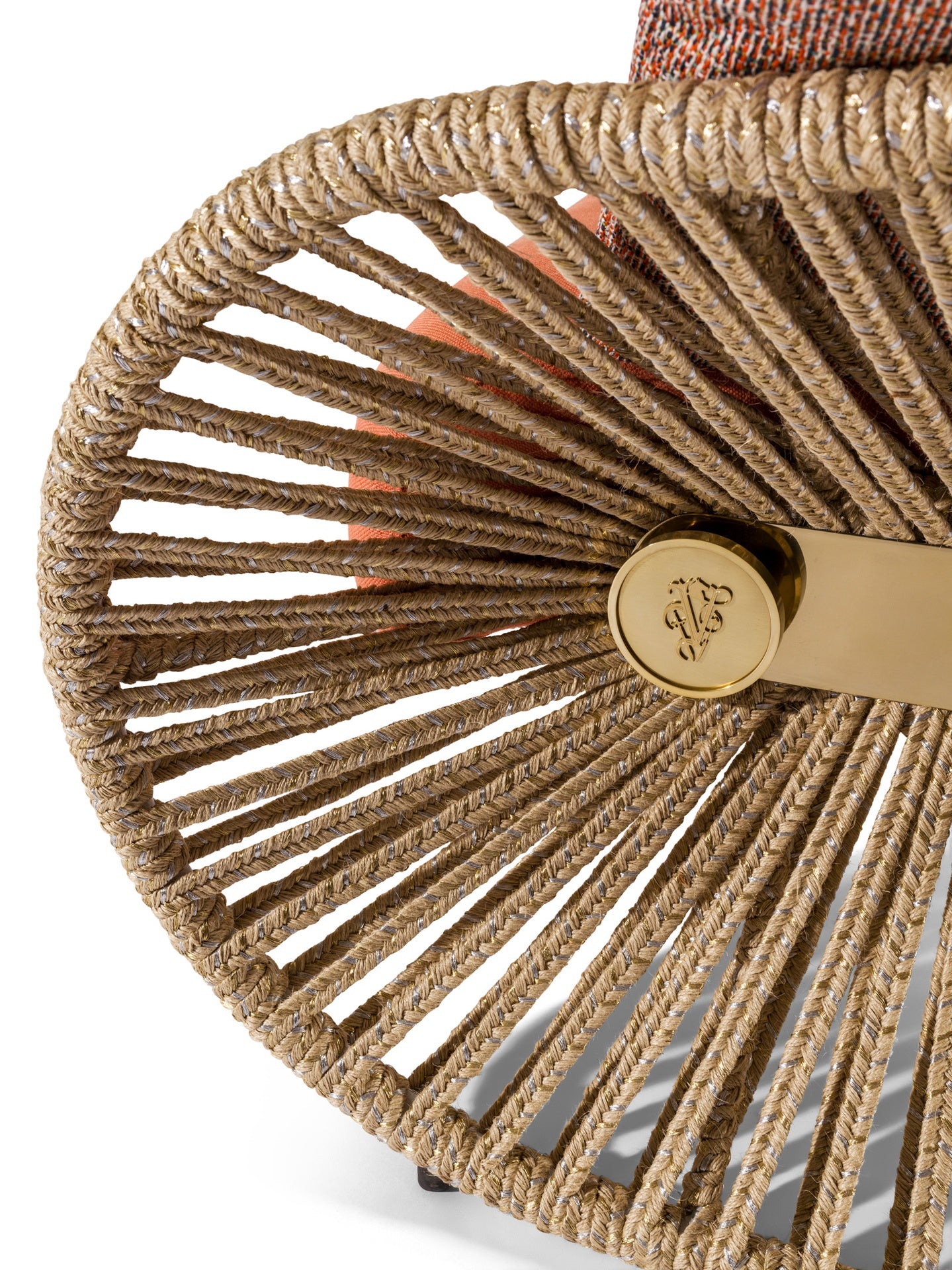 description | Rocking armchair upholstered in leather or fabric from outdoor selection, frame in lacquered and galvanised metal interwoven with hempen rope and lurex threads (gold and silver), with elastic spring belts on seat structure. Seat with padding in polyurethane with different densities protected by a water-resistant cover. Loose cushions in acrylic fiber. Rearback decorative elements in stainless steel and knobs in aluminium available with any finish included in the metal finish selection. |