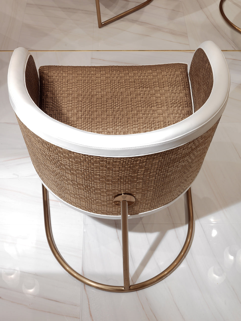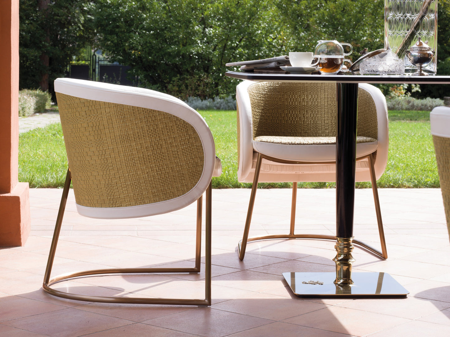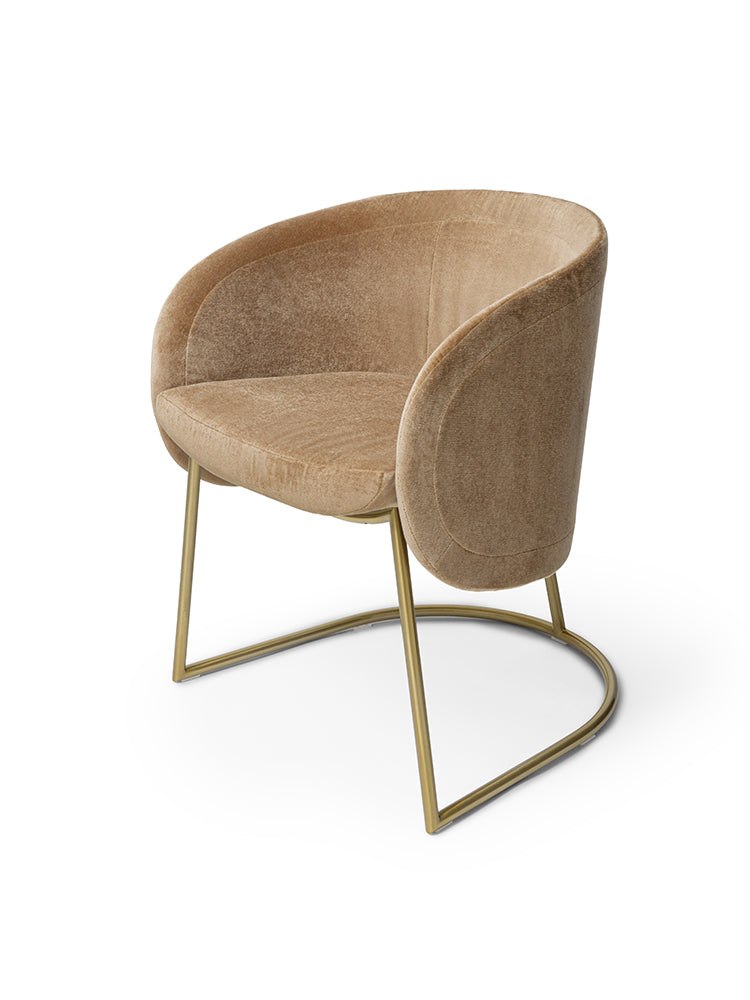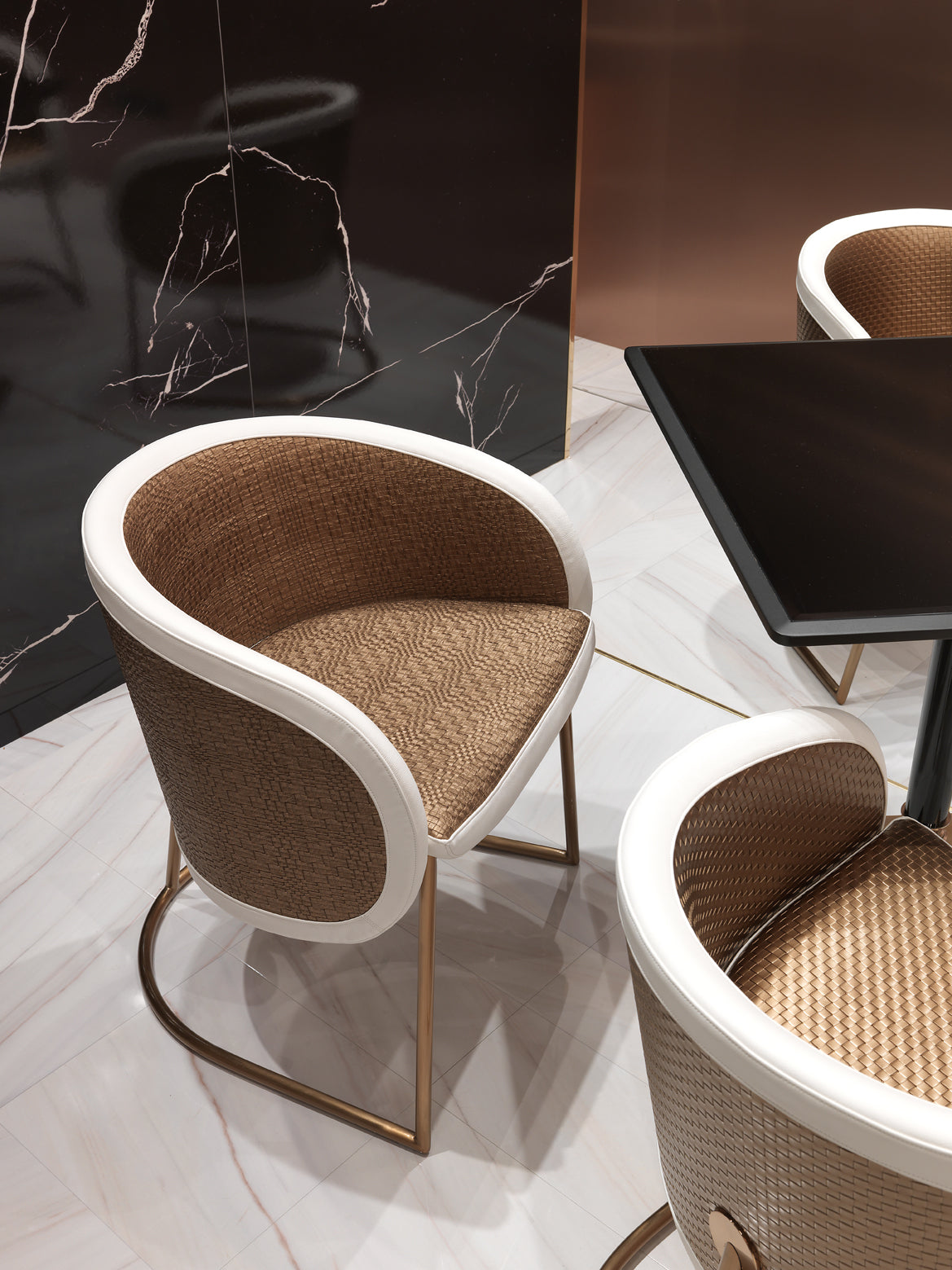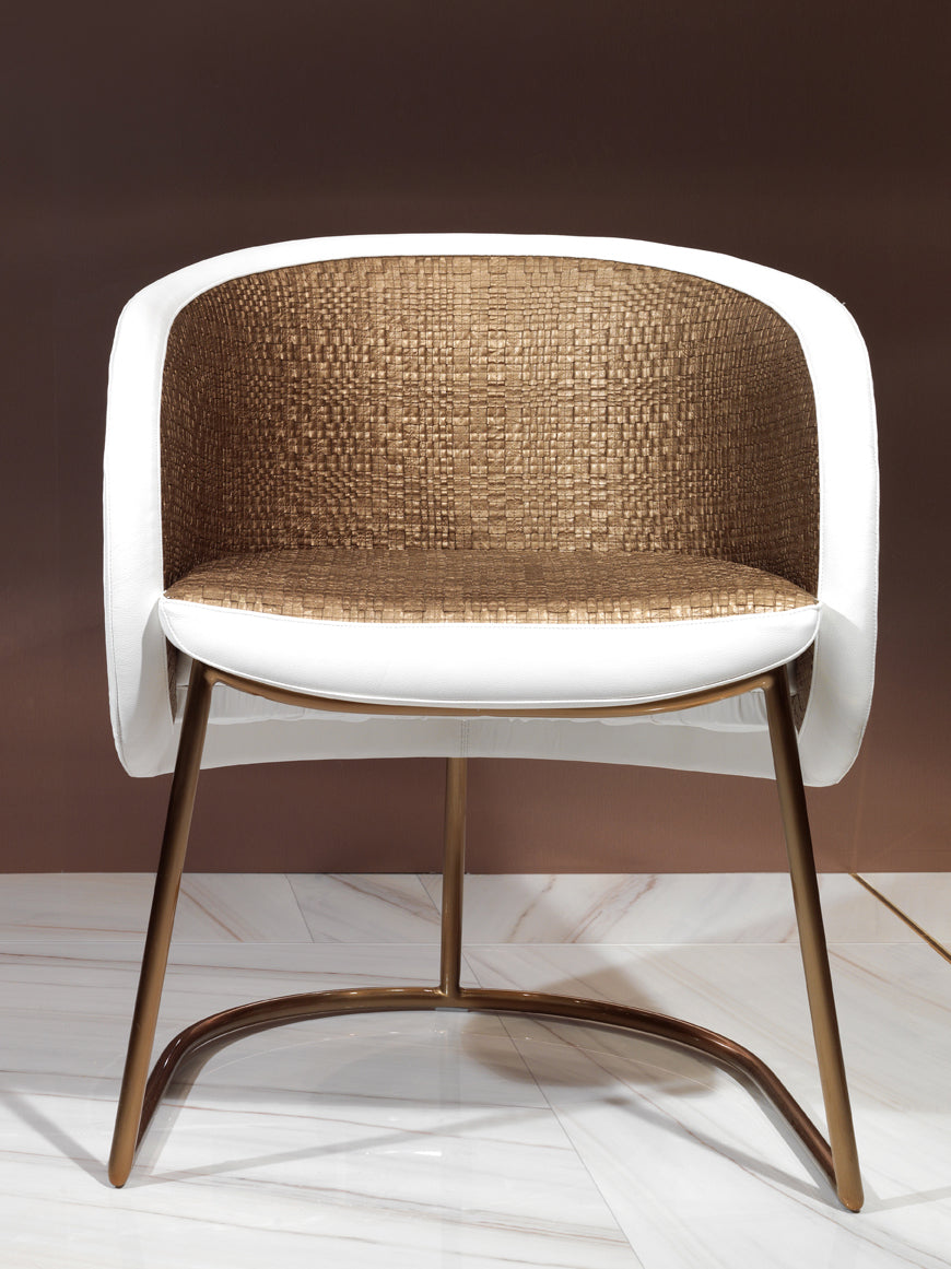 description | Upholstered chair with frame in polished stainless steel, structure of the curved backrest and seat in plywood. Padding in polyurethane in different densities. Main upholstery in leather or fabric. Metal parts available in the metal finishing selection. |