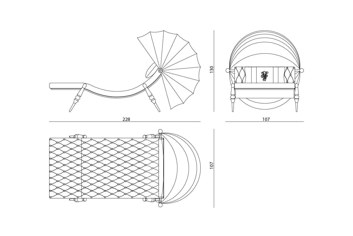 description | Structure in poplar plywood with support in metal for legs fixing. Padding in polyurethane in double density, for capitonné working. External profile in rigid polyurethane. Headrest cushion 60x30 cm in feather with pipings and with fixing bands. Upholstered with fabric or leather and with pipings. Sliding roof with adjustable inclination in fabric. Legs and turnings in shiny aluminium. Metal parts can be lacquered in any colour of the metal finish selection. and turnings in shiny aluminium. |