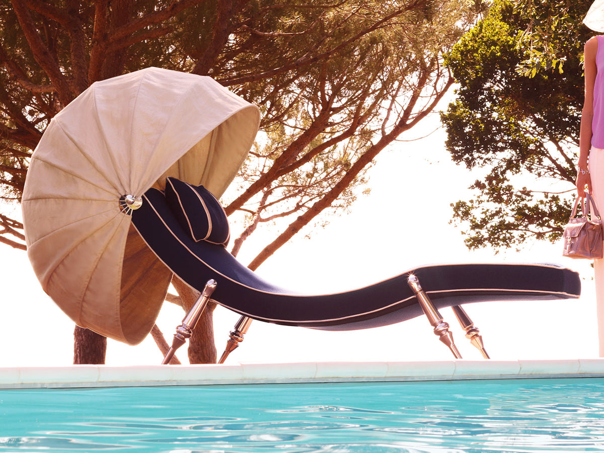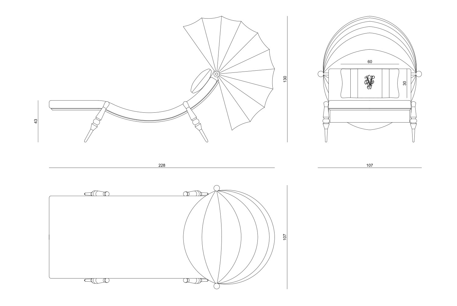 description | Structure in poplar plywood with support in metal for legs fixing. Padding in polyurethane in double density, 40 kg/m3 (rigid) and 30 kg/m3. External profile in polyurethane d. 70 kg/m3 (rigid). Acrylic layer 100 gr. Headrest cushion cm. 60x30 in feather with pipings and with fixing bands. Upholstered with fabric or leather and with pipings. Sliding roof with adjustable inclination in fabric. Legs and turnings in shiny aluminium. |