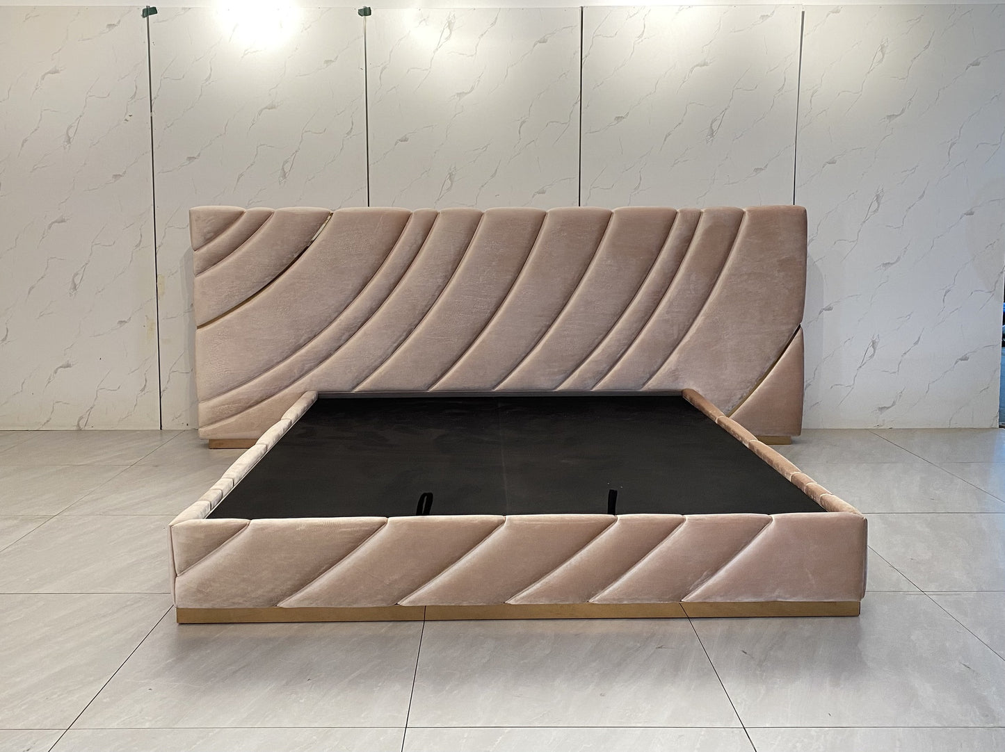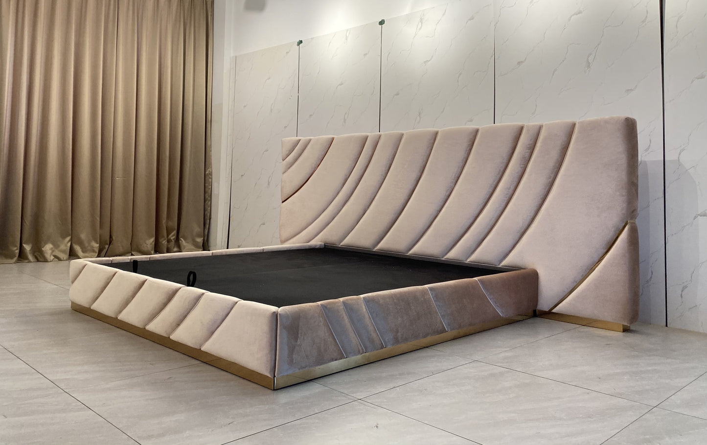 description | Bed upholstered in leather or fabric, headboard composed by a structure in poplar plywood and bands padded and upholstered one by one, creating a three-dimensional patter decorated with polished stainless steel friezes. To be wall mounted. Bed frame with structure in plywood, padded in polyurethane foam and decorated with quilting. Bed can be provided disassembled. Plinth in polished stainless steel. Wooden slats supported by four corner brackets and one central rod, with adjustable height. The metal parts are available with any finish included in the metal finish selection. Shown with bed linings, pillows and bedcover Techno. |